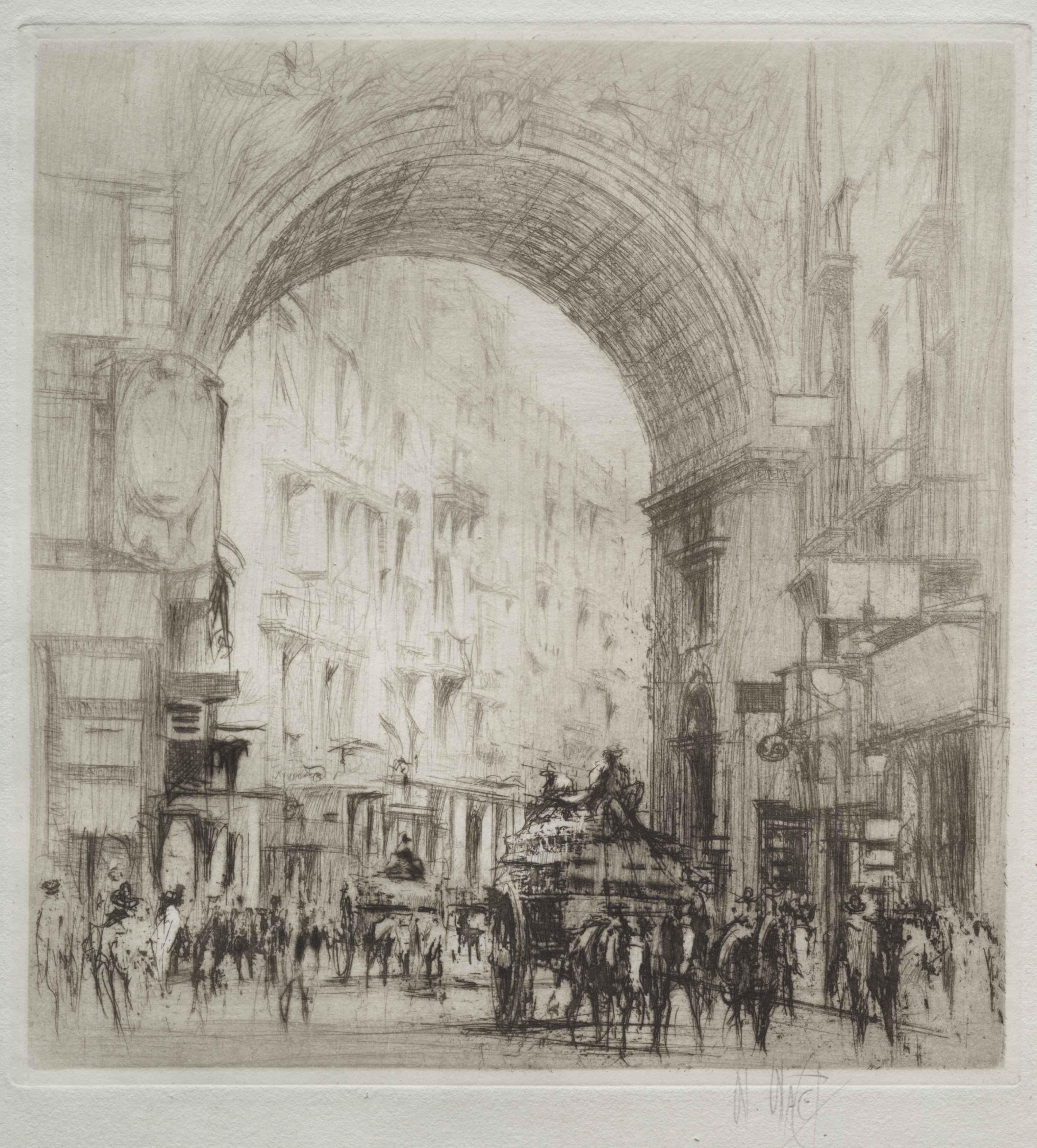 A city street scene with a large stone arch spanning the road. The arch is rounded and appears old. There are people and horse-drawn carriages on the street. The buildings on both sides of the street are tall with many windows and balconies. A statue of several people on a pedestal sits beneath the arch. The scene is depicted in shades of gray.