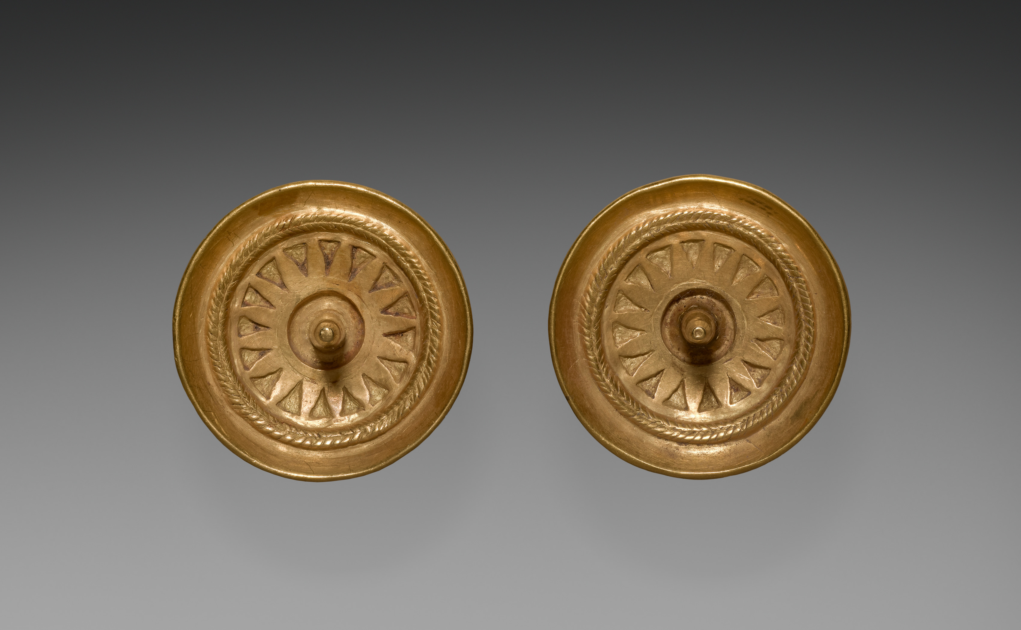The image shows two gold earrings. The earrings are circular and made of gold. They have a raised edge around the outside. Inside the raised edge is a rope-like design. Inside that is a circle of triangles with the point facing inwards. In the center is a small circle with a dot in the middle. The background is gray, with the top being darker than the bottom. Search for "Ear Spool by" and the name of the artist.