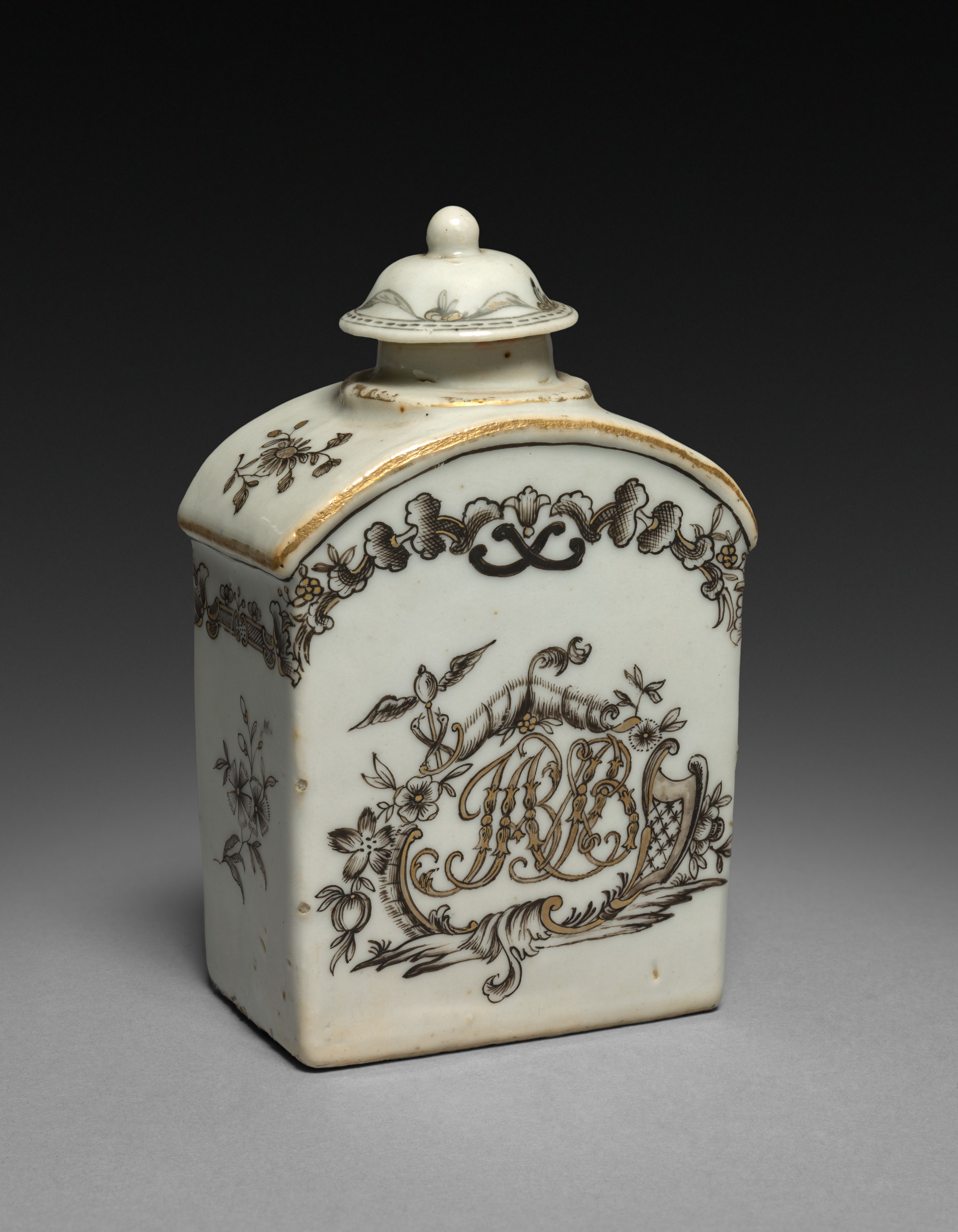 White porcelain tea caddy with a lid, featuring a floral design and a gold border around the edges. The caddy is square with a curved top and a small knob on top of the lid. The floral design includes black and gold flowers and leaves. A large monogram in the center reads "A B" in gold and black. The background of the image is dark gray to black, with the caddy sitting on a light gray surface.