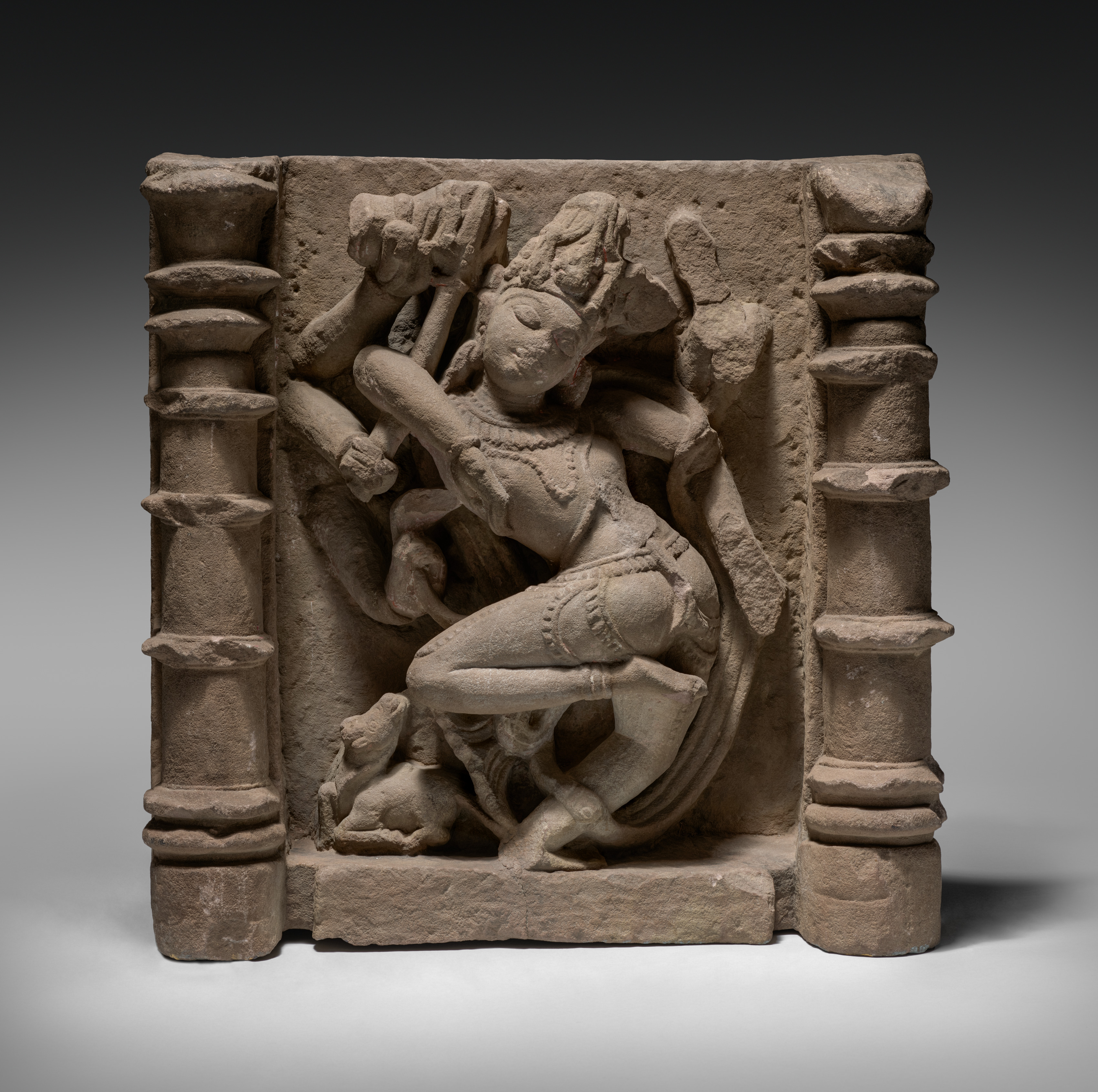 Brown stone sculpture of Shiva with eight arms dancing between two pillars. The figure has a long-haired hairstyle, a necklace and garment around waist. The figure has one bent leg and one straight leg. The eight arms are raised. The right pillar has eight stacked disks. The left pillar has seven stacked disks. The background fades from dark to light gray.