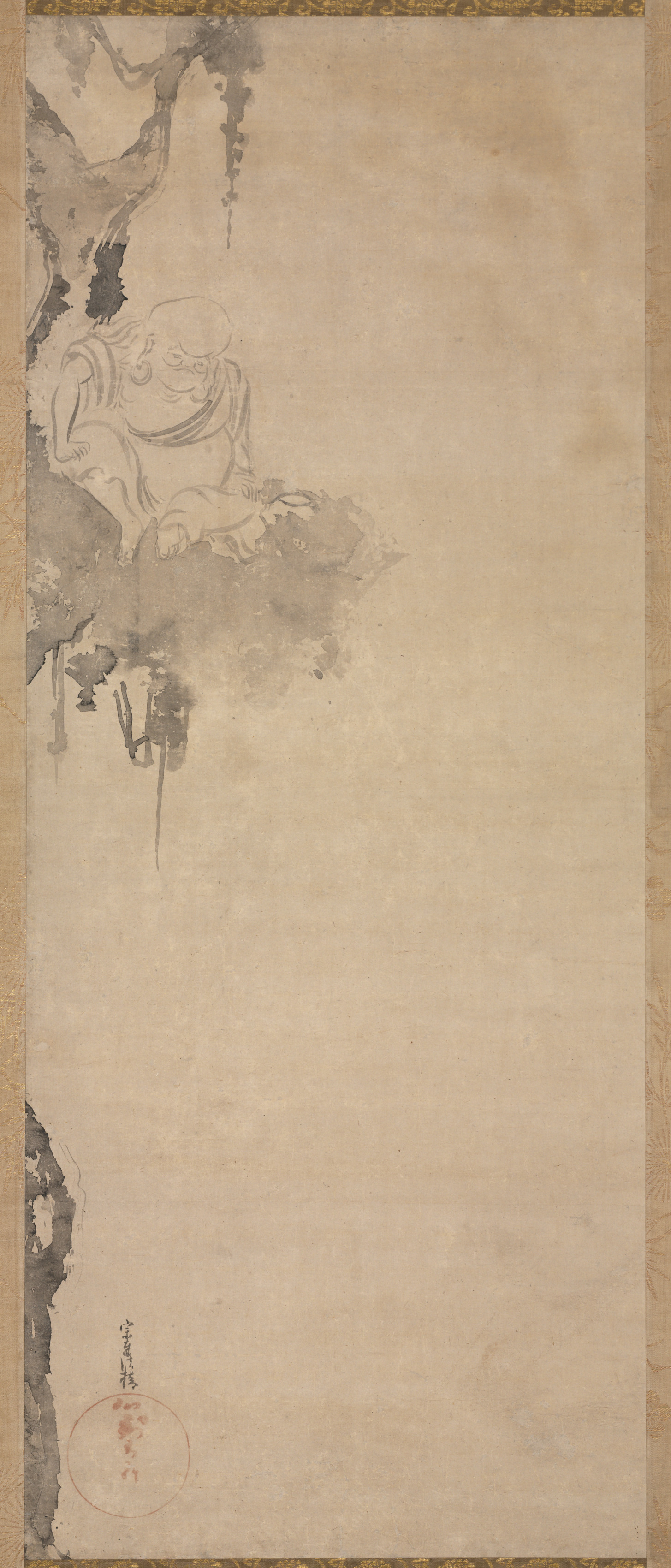 The Bird's Nest Patriarch by Tawaraya Sōtatsu: A vertical, beige-colored scroll painting with a gold border. A small, gray drawing of a man sitting on a rock is in the upper-left corner. The man has a large head, a round belly, and wears a robe. He appears to be under a tree. A red seal is in the bottom-left corner. The majority of the painting is empty space.