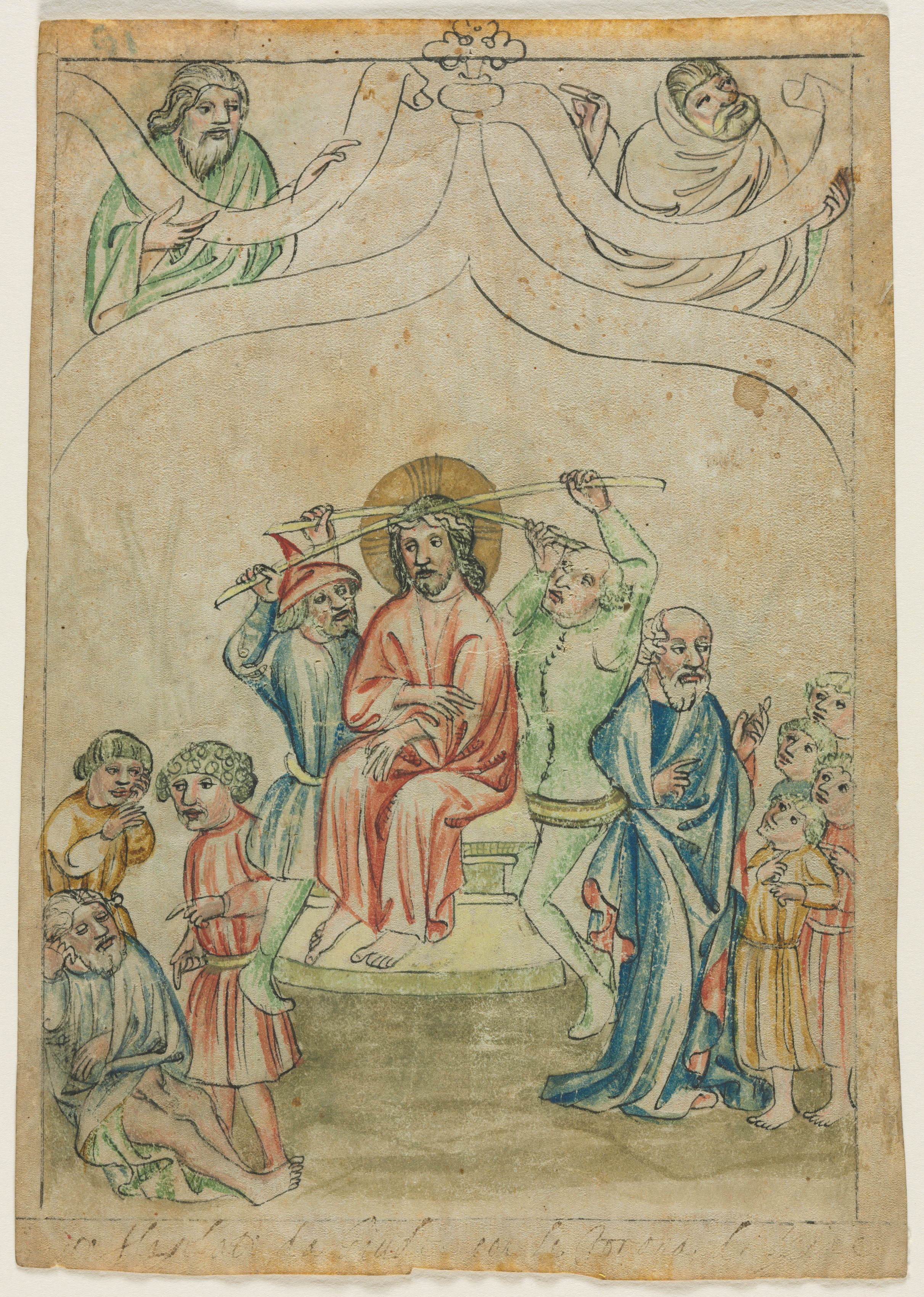 Beige-colored parchment with darker beige-colored spots. Drawing of a seated figure in a red robe on a platform. Two men on either side place a crown of thorns on his head. Two men on either side of the seated figure hold long sticks. The two men on the right wear blue and green robes. A man on the left wears red and blue robes and a red hat. Two men on the left wear yellow and blue robes and kneel. Approximately seven other standing figures surround the seated figure. Two figures float on either side at the top, holding the ends of a cloth. The cloth floats above the seated figure's head.