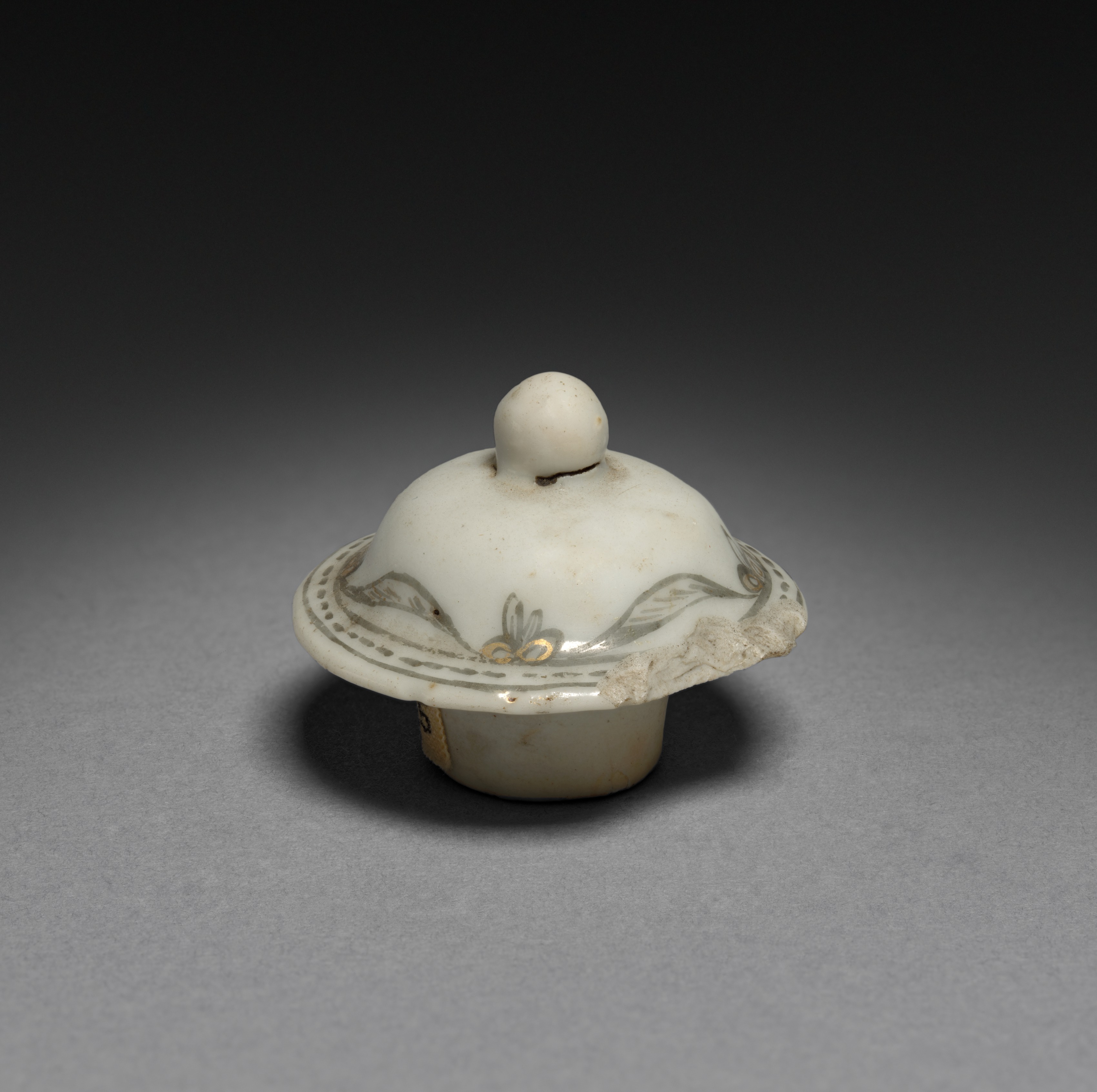 Tea Caddy (lid) by unknown artist. Small white ceramic lid with a round knob on top. The lid is domed and has a decorative edge with a leaf pattern. The leaf pattern is gray with gold accents. There are two concentric circles around the edge of the lid. The lid appears to be chipped on the edge. It is sitting on a short cylindrical base. The background is dark gray, getting lighter towards the bottom. The object casts a shadow on the surface it's sitting on.