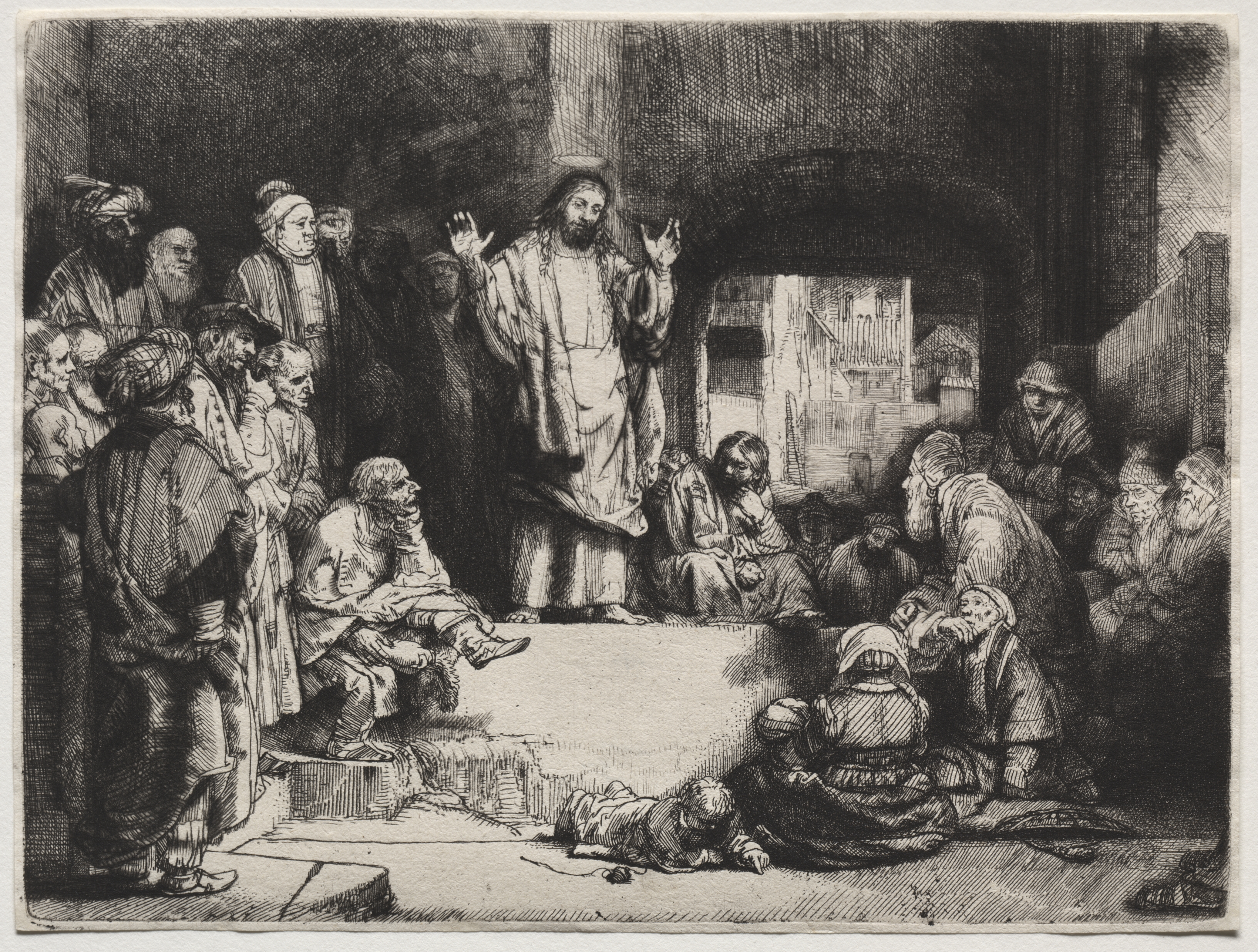 Black and white image. Christ standing on a platform in the center, wearing a long robe and with hands raised. Christ has long hair and a beard, and a halo above head. Group of approximately 16 people around and below platform. People are dressed in robes and turbans. Some sitting on the ground, some standing. One person lying on the ground to the right. Archway behind Christ. Light source from the right. Dark shadows on the walls and in the archway. Image has a rectangular shape with a thin white border.