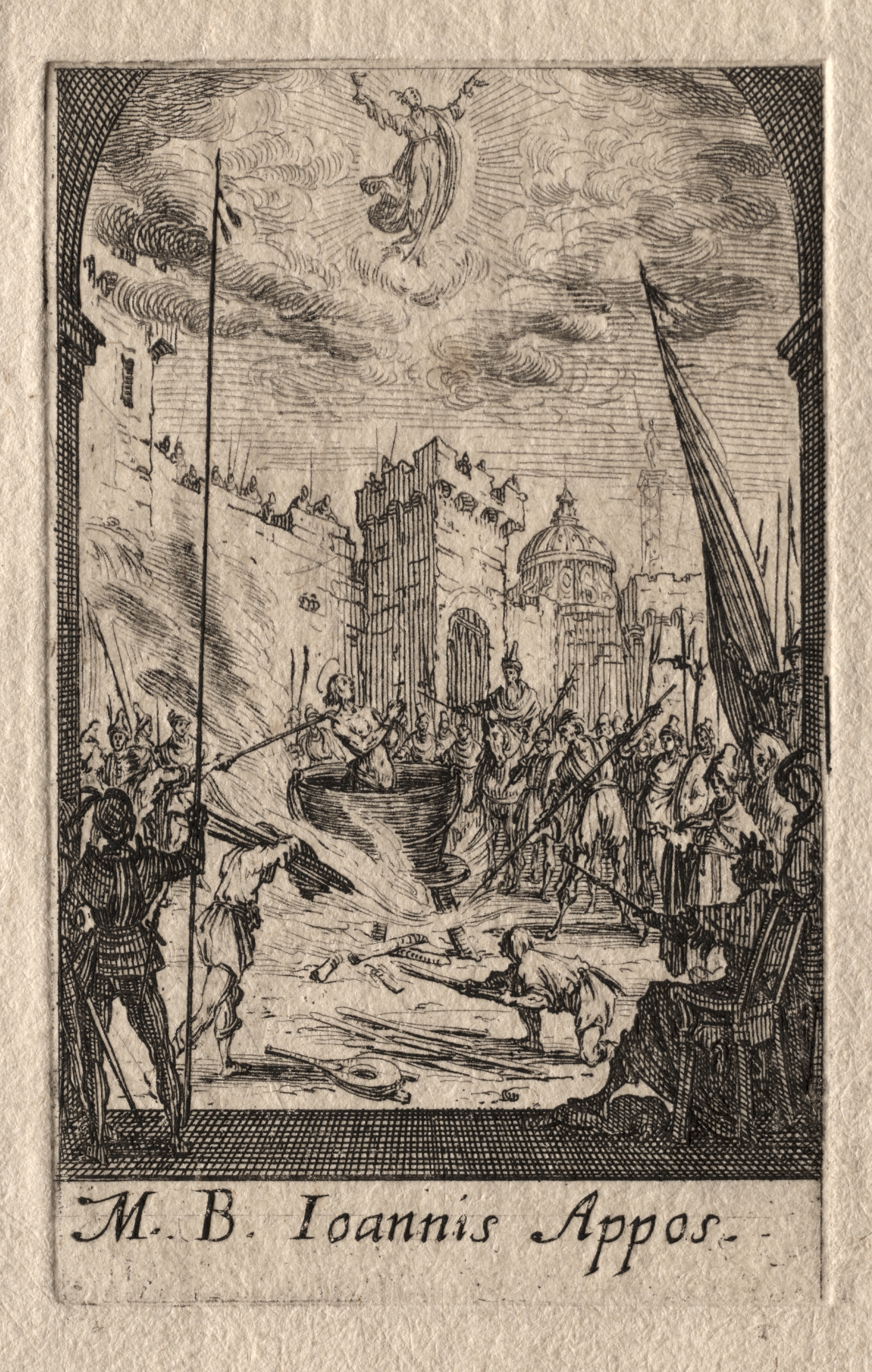 Black and white engraving depicting a chaotic scene. A man is being lowered into a large pot or cauldron. The man in the pot appears to be surrounded by boiling water. Several people are gathered around, some holding weapons like spears and swords. A few are on horseback. In the background, there are buildings, including one with a dome. An angel is visible in the sky. The scene is framed by archways on either side. The text at the bottom reads "M. B. Ioannis Appos."