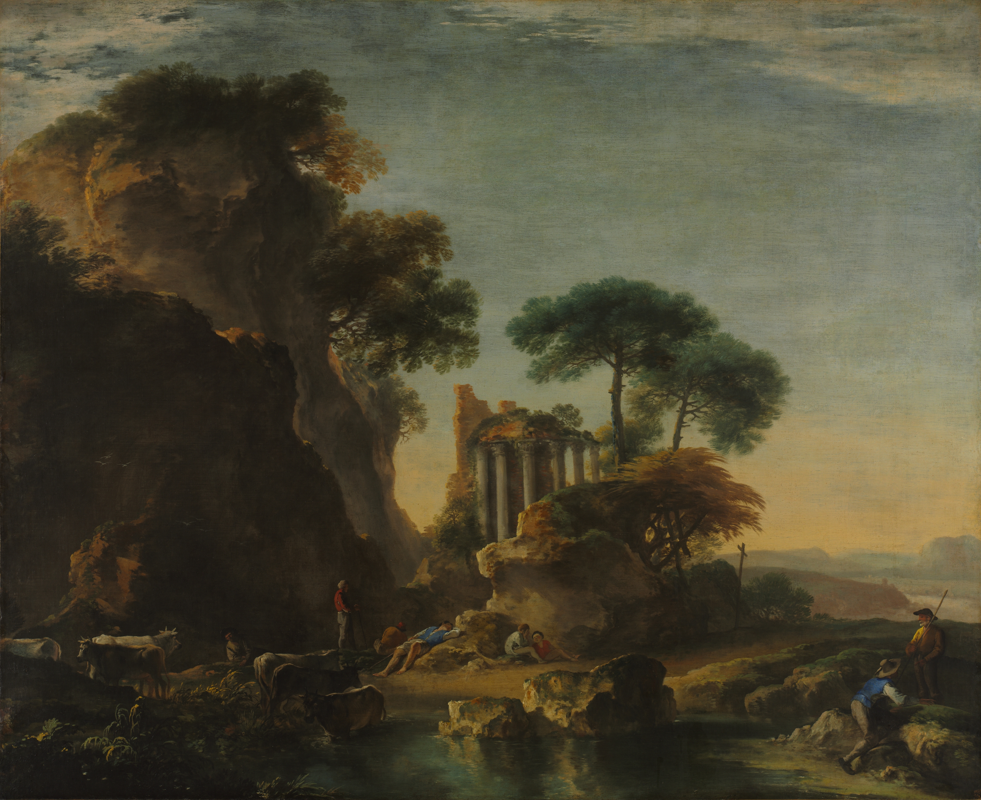 The painting depicts a rocky landscape with ruins. A large rocky cliff dominates the left side. The cliff is brown with some greenery. A group of people sit and stand on the shore. Cows are grazing near them. In the background, there are ancient ruins with columns. Trees are scattered throughout, and a body of water is at the bottom. The sky is cloudy and blue with some yellow. A man holds a staff on the right side. Hills are visible in the distance on the right. The painting is titled "Ruins in a Rocky Landscape" by Salvator Rosa.