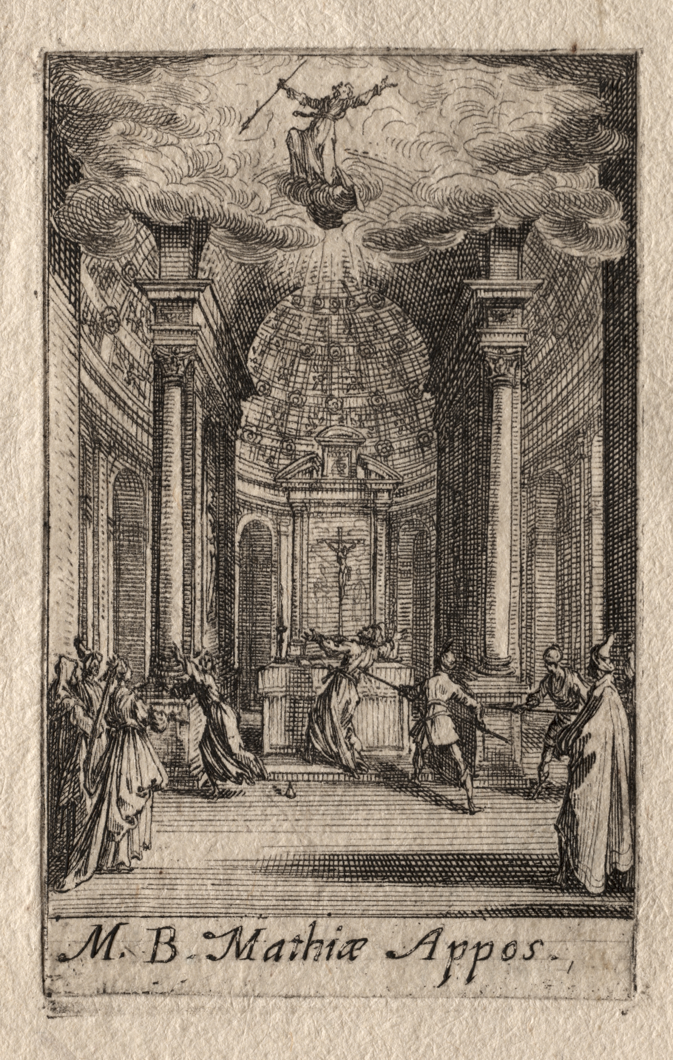 Black and white etching depicting a scene of the martyrdom of St. Matthias. The scene shows a domed building with columns. In the foreground, several people are present; one on the right appears to be wearing armor and a helmet-like hat, another on the right appears to hold a spear, and two on the left appear to throw rocks. The central figure, presumably St. Matthias, falls to the ground with arms outstretched. The background shows an altar with a crucifix on the wall behind it. An angel with a spear appears to descend from a cloud in the sky. The bottom of the etching reads "M.B. Mathias Appos."