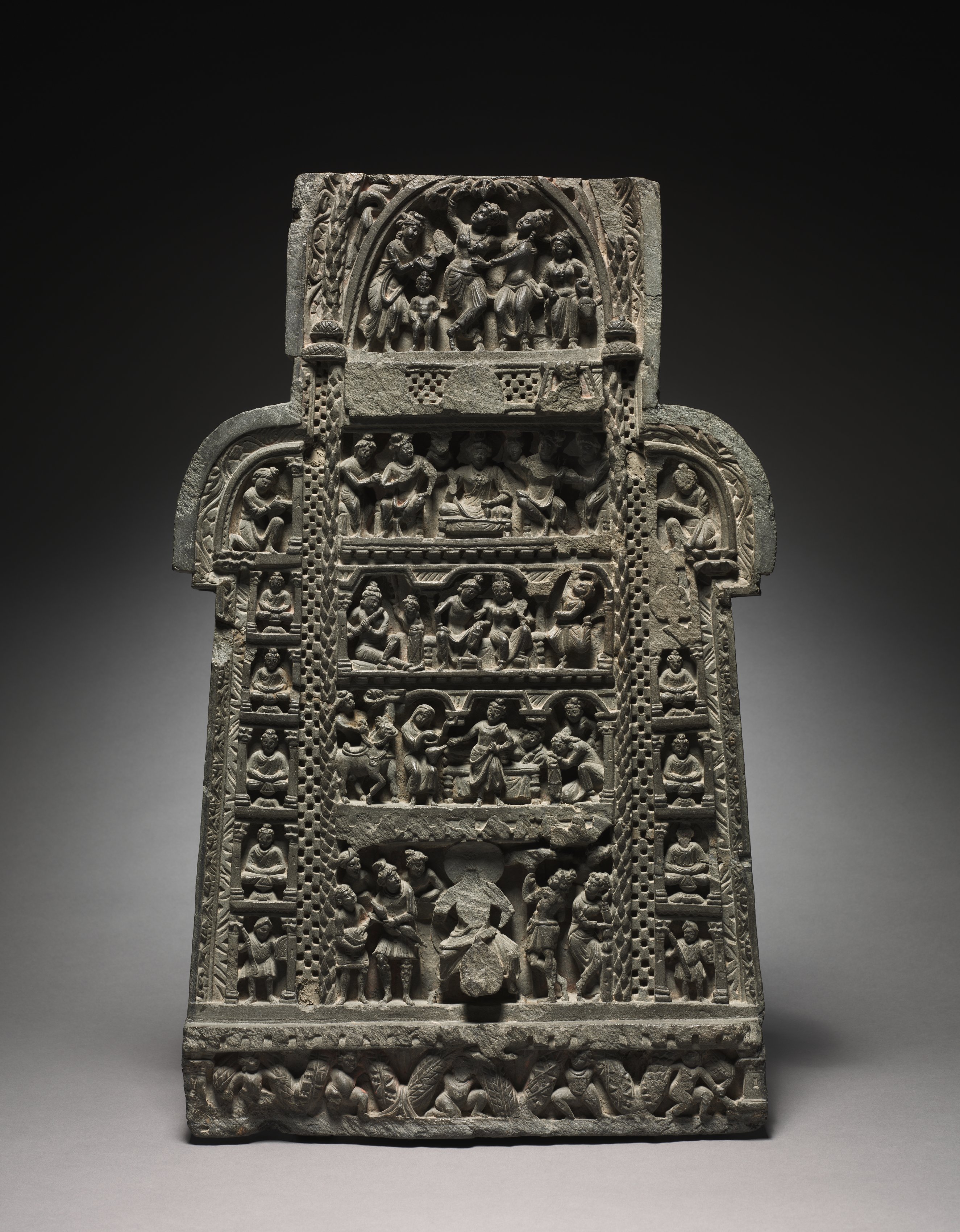 Gray stone sculpture of a gate or archway titled "Scenes from the Life of Buddha" by an unknown artist. The sculpture is rectangular and has a flat top. The top section features a rounded arch with multiple figures carved into it. Below the arch are several horizontal panels with intricate carvings depicting various scenes. The panels show people in different poses and activities. The sides and bottom of the sculpture also feature carved designs and figures. The background of the image is dark gray to black, with a lighter gray surface that the sculpture is sitting on. The overall appearance is one of detailed, ornate carvings on a stone structure.