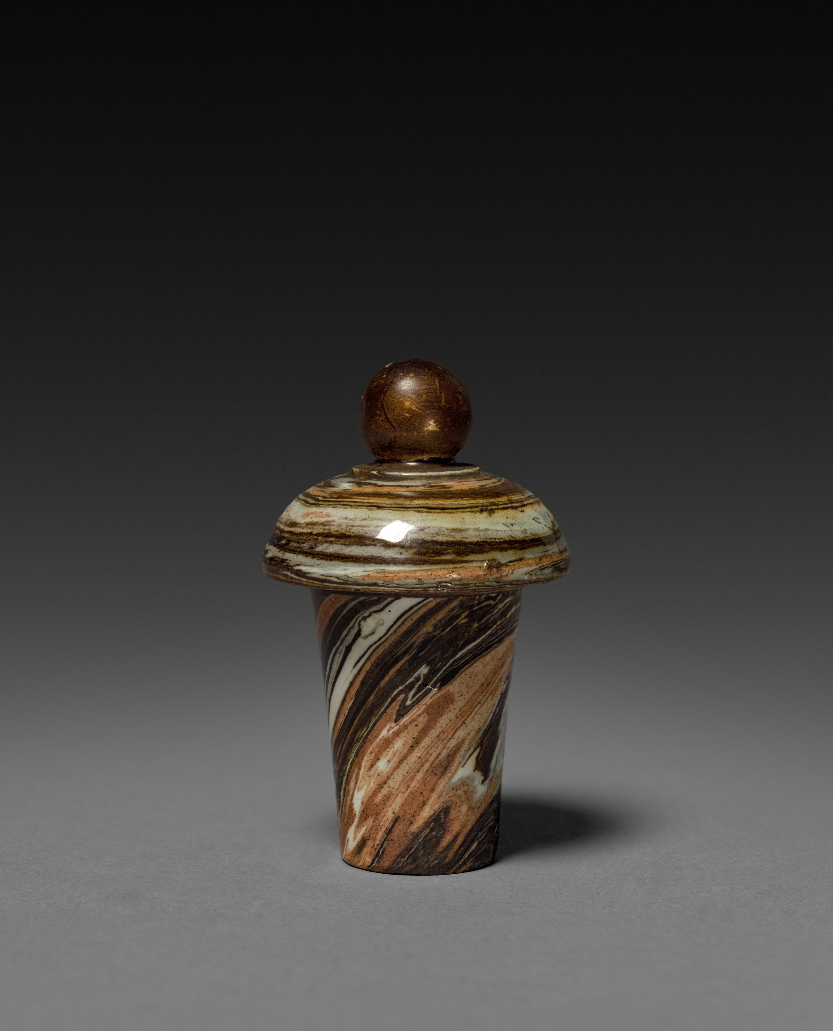 The image depicts an urn lid. The lid is made of marbled ceramic or stone and features a predominantly brown, white, and black color scheme. The lid has a rounded knob on top and a wide base that tapers inward. The marbled pattern consists of swirling streaks of brown, white, and black. The lid appears to be glossy and reflective. The background is a dark gray gradient, with the object casting a shadow on the surface below.