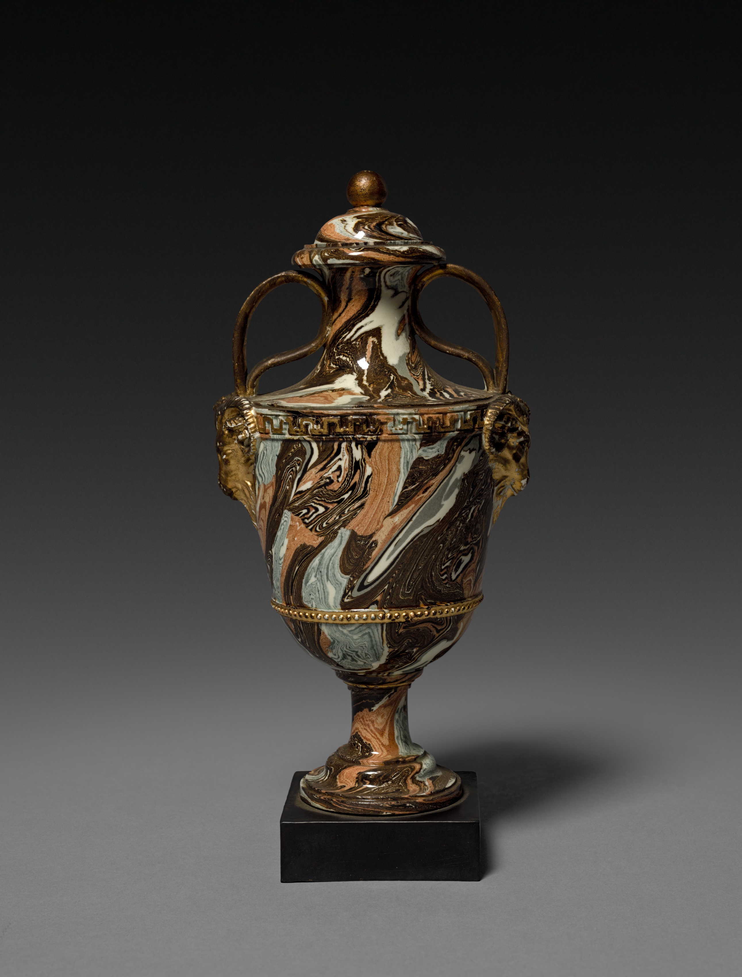 The urn, by Grayson Perry, is a ceramic piece featuring a mix of earthy tones including shades of brown, orange, gray, and white. The body of the urn is on a narrow base and widens towards the middle before tapering to a narrow neck that supports the lid. Two handles are attached to the sides. The lid is dome-shaped with a small spherical finial on top. A decorative band encircles the middle section. The urn sits on a black square base.
