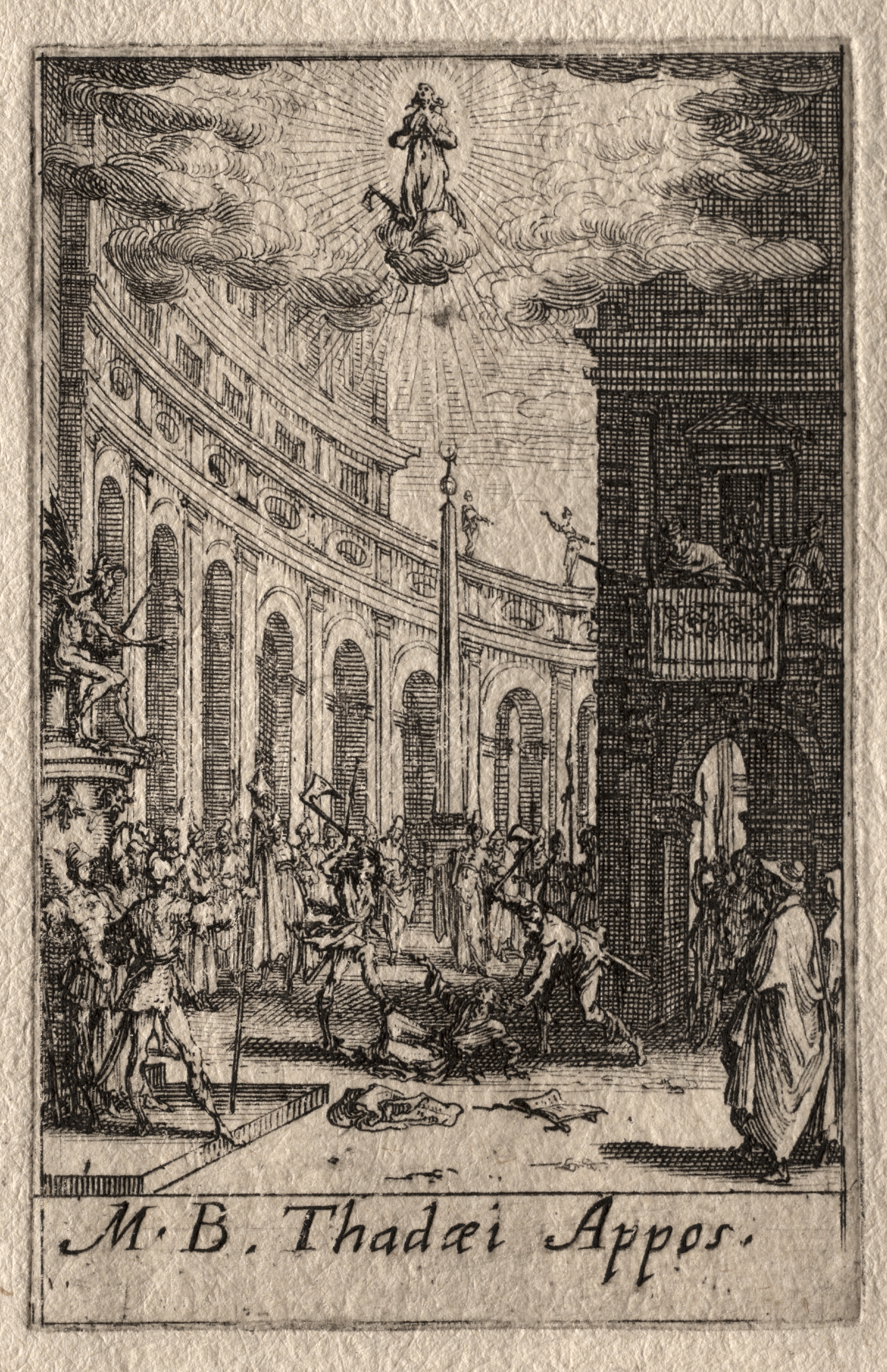 Black and white image. A man on a cloud with rays of light emanating from him appears in the sky. A large amphitheater with arches is on the left. A dark building is on the right. Many people are gathered. Some are armed. One man lies on the ground with his head severed from his body and positioned to the left of his body. The text "M. B. Thadei Appos" is written near the bottom.