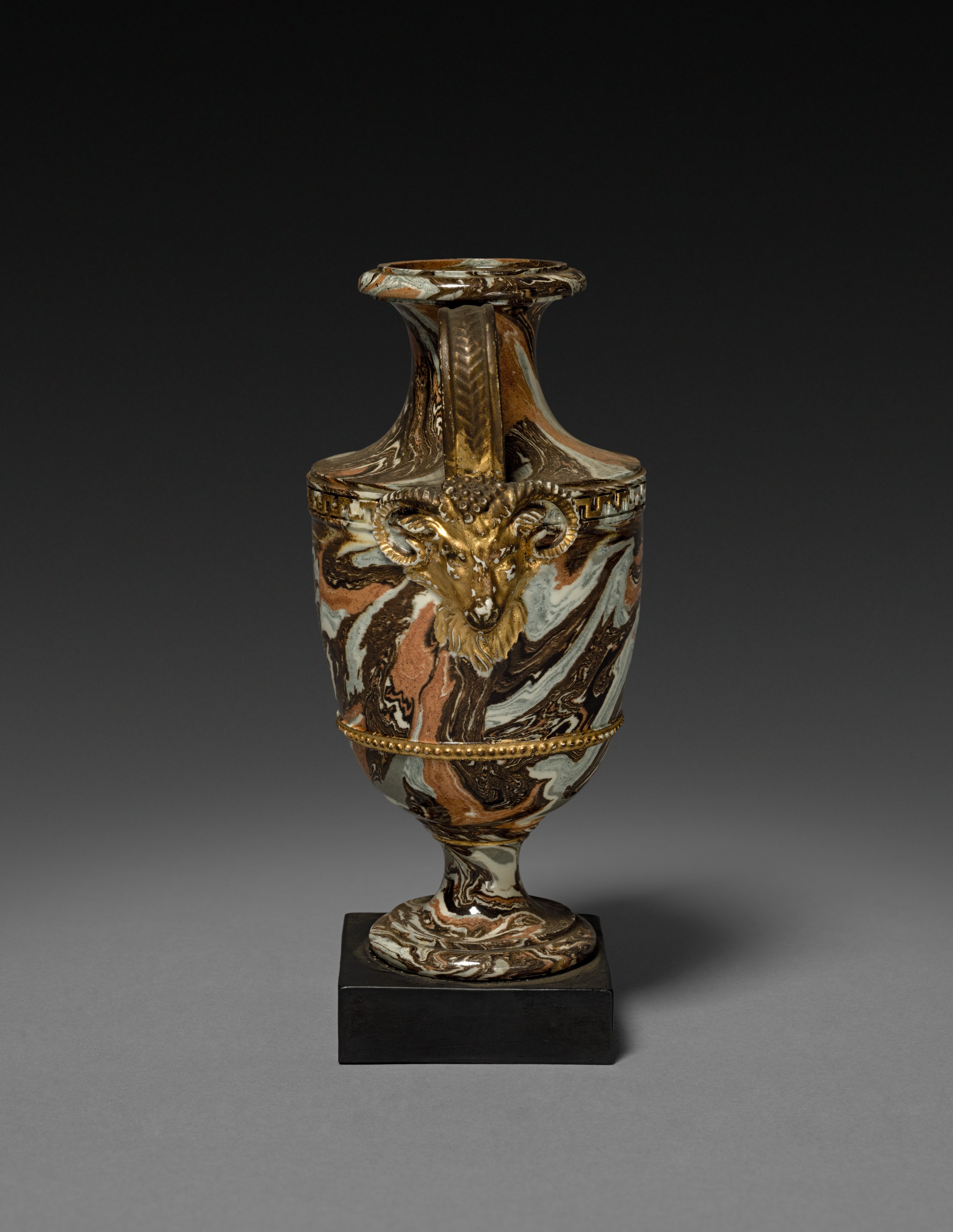 Urn by Artist. The urn is vase-shaped with a wide mouth and a narrow base. The body of the urn is decorated with a mix of brown, white, and orange swirling patterns. A gold-colored ram's head protrudes from the front of the urn, and there are gold accents around the top and middle of the urn. The urn sits on a black square base. The background is dark gray to black, with a shadow cast by the urn to the right.