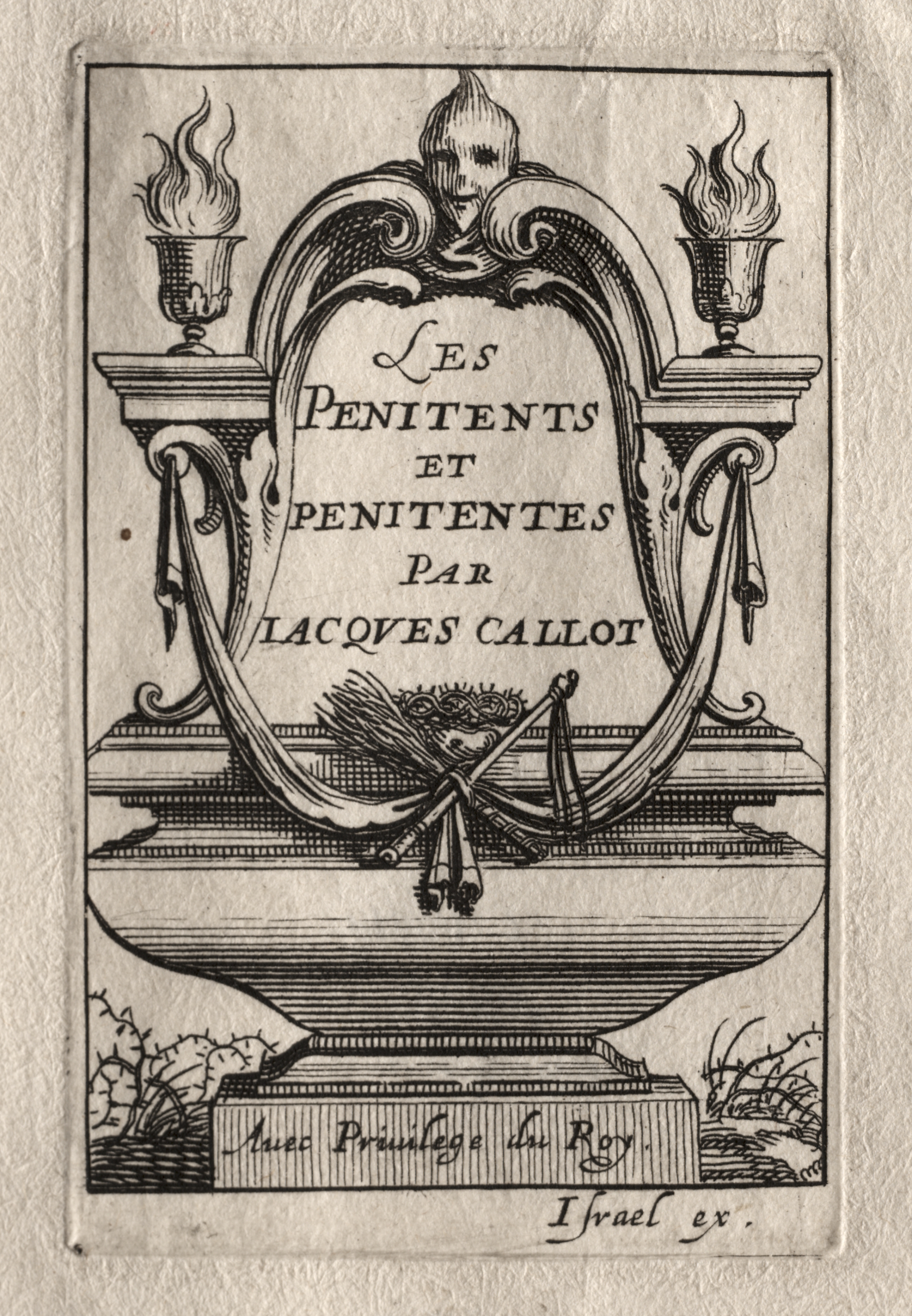 A black and white illustration of a decorative oval frame sitting on a bowl-like structure. The frame has a flame burning on a stand on either side. A flame-shaped finial sits atop the frame. The frame sits on a base with writing on it. There is writing in the center of the frame and at the bottom of the image. The background resembles aged paper.