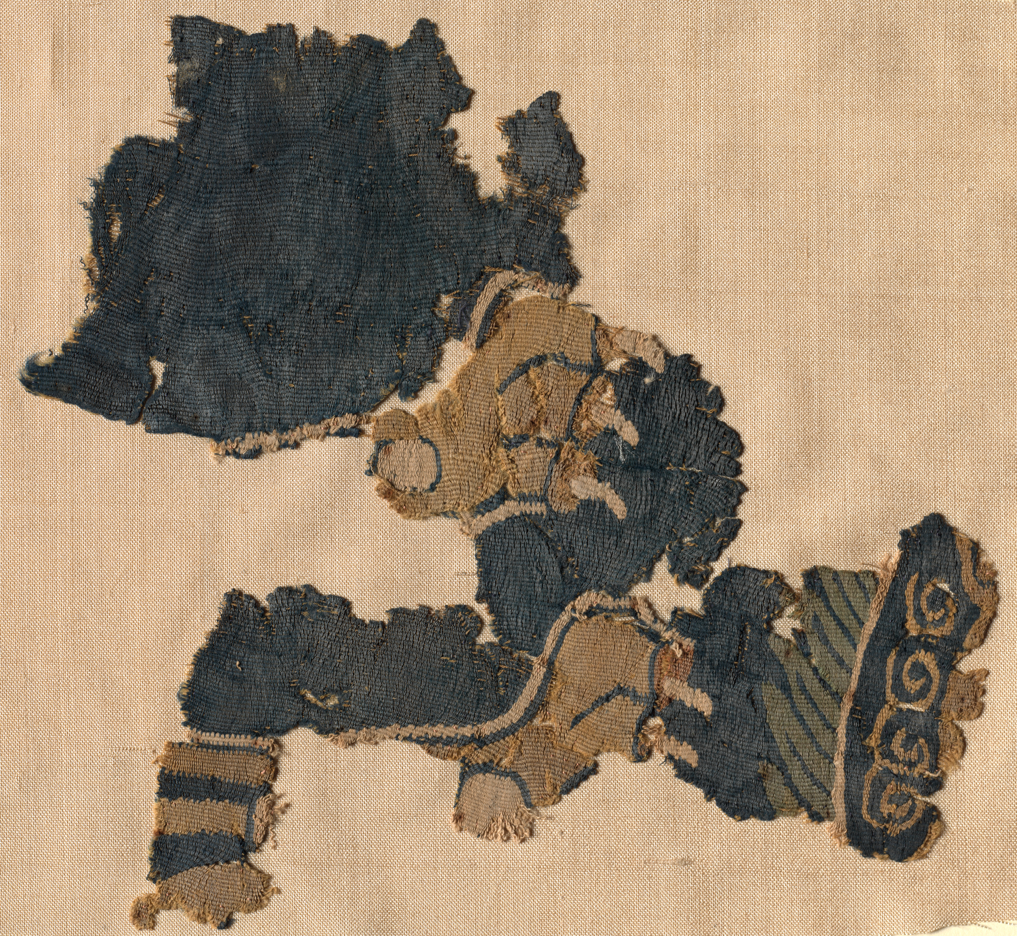 Fragment of a textile with a tan background, possibly a hanging. The fragment features several dark blue and tan-colored pieces of fabric with frayed edges. One piece has a striped pattern, while another has a design with circles and curved lines. The fabric appears to be woven with a visible grid pattern. The edges of the fragments are rough and torn. The overall appearance suggests an ancient or vintage textile.
