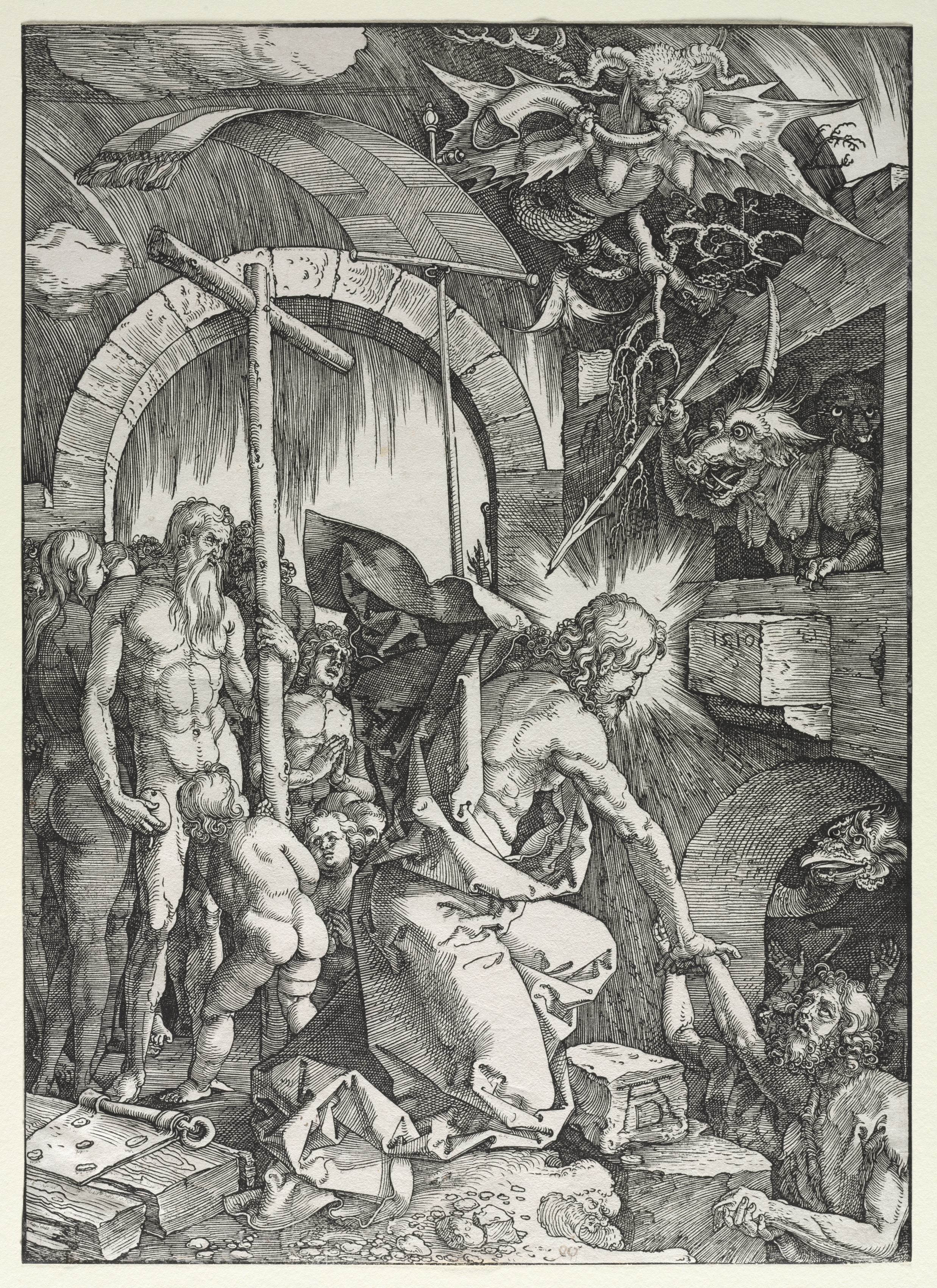 Black and white image of a man with a halo around his head reaching down with his right arm to a man on the ground. The man on the ground is reaching up to the man with the halo. The man with the halo is surrounded by approximately 10 other men and 3 demons. The man with the halo is kneeling on one knee. The scene takes place under an archway. There are stone steps on the right side. The sky is cloudy. A demon-like figure with wings flies in the sky above.
