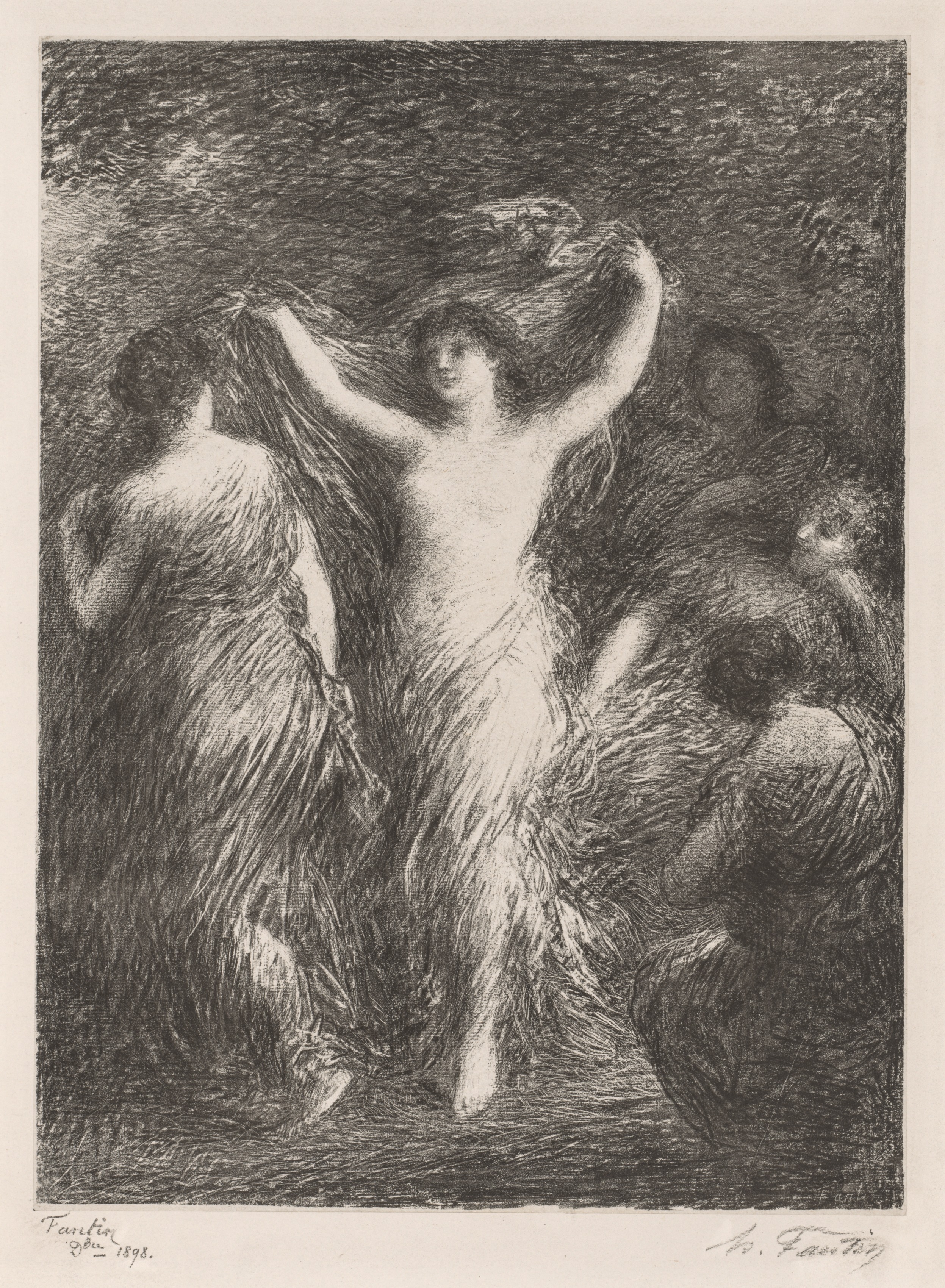 Black and white etching of three female figures dancing. The central figure is barefoot and topless, wearing a long skirt; she faces away from viewer with arms raised above her head. Her skirt flows around her. Two other female figures appear on either side of her. The background is dark with shading.