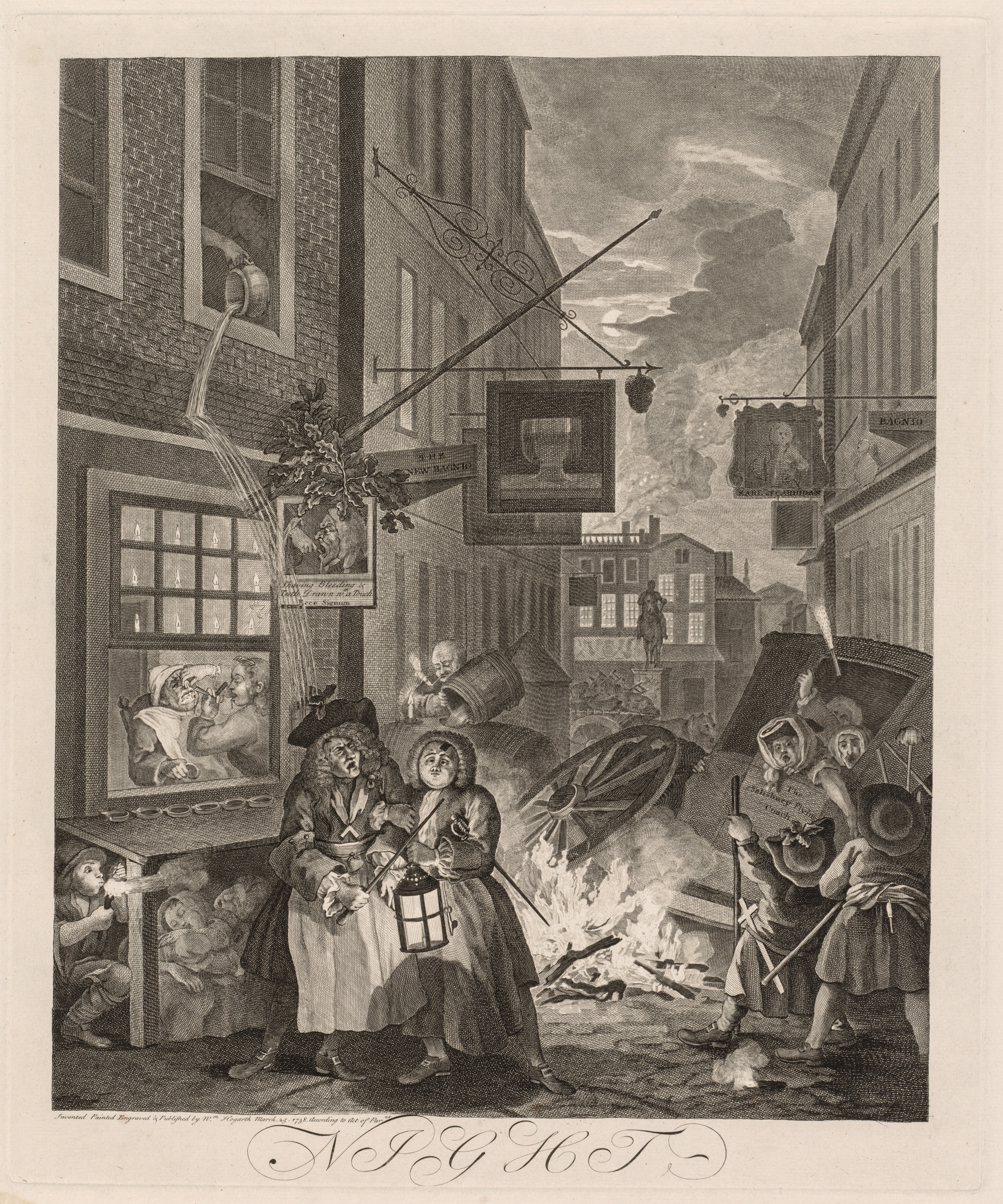The image depicts a nighttime scene of a street with several people. A woman and man in old-fashioned clothing sit on the left side, she holding a lantern. A man walks behind them, with two others on the right. A fire burns on the street. Buildings line both sides, with a sign and a tree visible on the left. The sky is cloudy and dark. The title, "The Four Times of Day: Night", and the artist, William Hogarth, are associated with this image. The text "NIGHT" is written in cursive at the bottom.