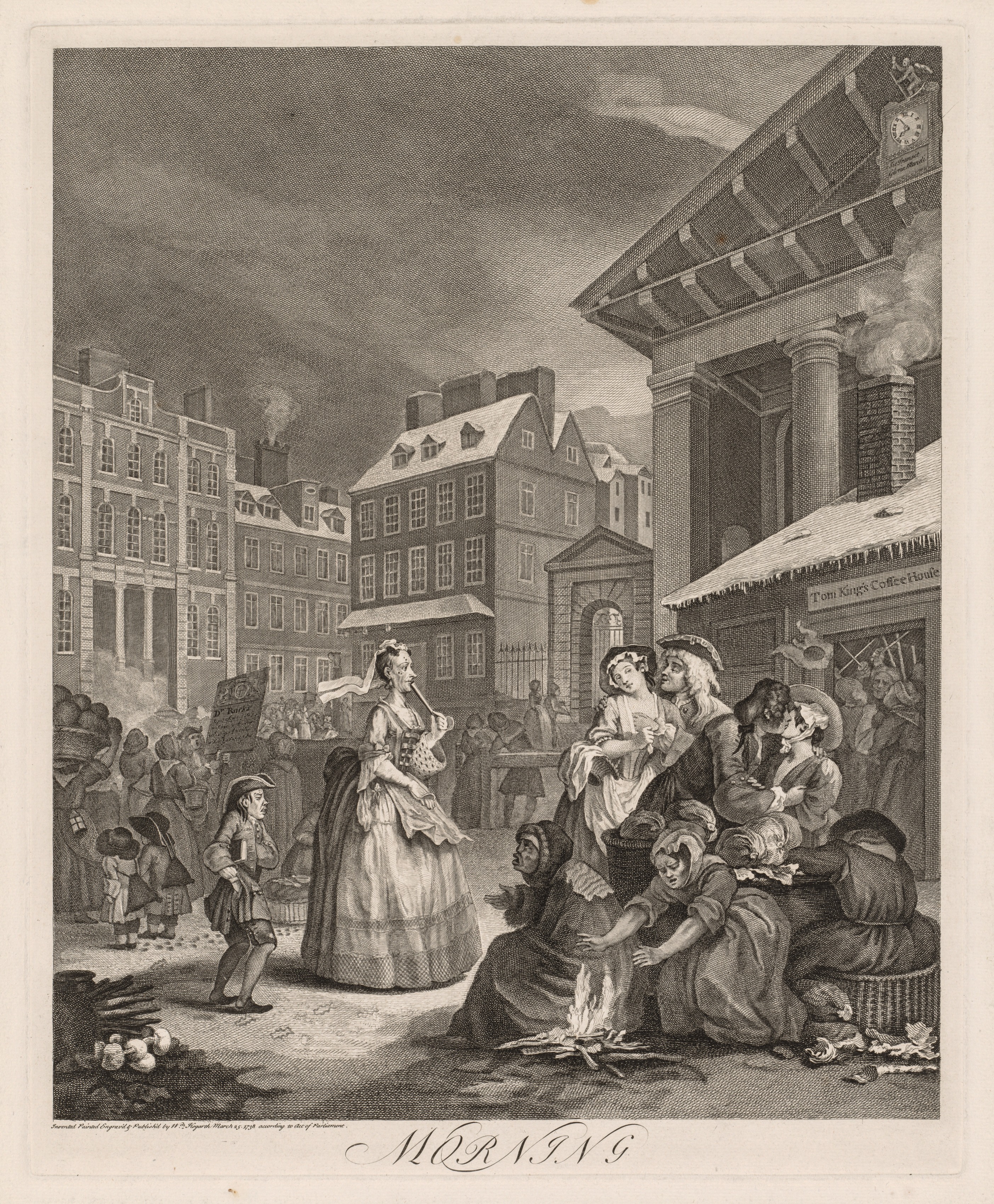 The image shows a black and white illustration of a street scene. A group of people are gathered on the right side of the street. A woman in a dress and head covering sits on the ground by a small fire, surrounded by several other people. To the left of the group, a woman in a long dress stands. A man in 18th-century clothing stands to her left. In the background, there are several buildings, including a large brick building with many windows. A sign reads "Tom King's Coffee House." The sky is cloudy and dark. The word "MORNING" is written at the bottom of the image.