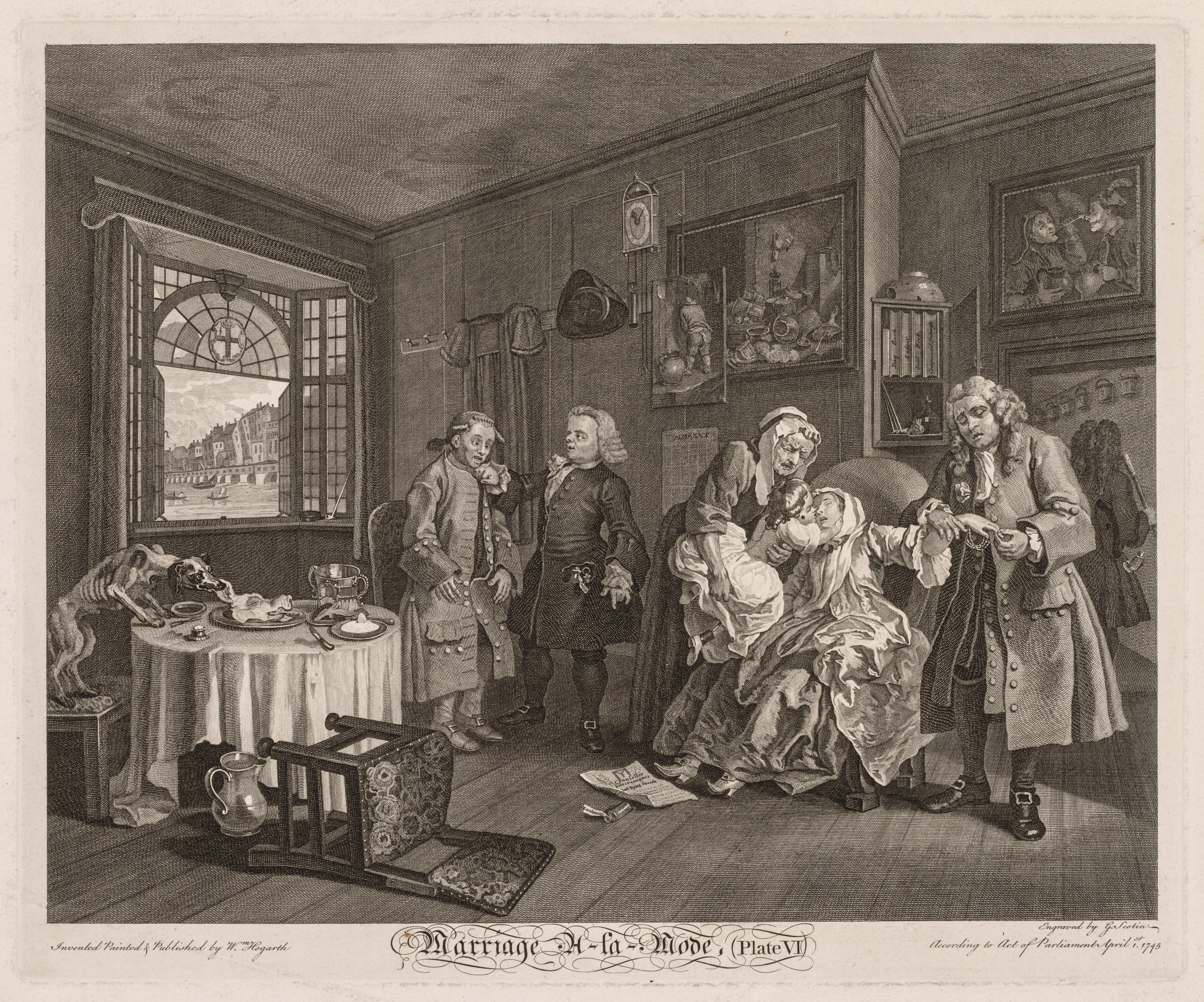The image depicts a scene in a room with several people. A man on the right side of the image is holding a sheet of paper. A man on the left side of the image is smoking a pipe. A woman on the center-right side of the image appears to be ill or injured and another woman tries to care for her. A dog skeleton on the left eats food. A table with a white tablecloth and various objects on it sits on the left. An open window on the left shows a view of a town outside. A fireplace on the back right side of the image contains cooking utensils hanging above it. A framed picture hangs on the wall on the right side. The room has dark walls and a tiled floor. The image is in black and white.