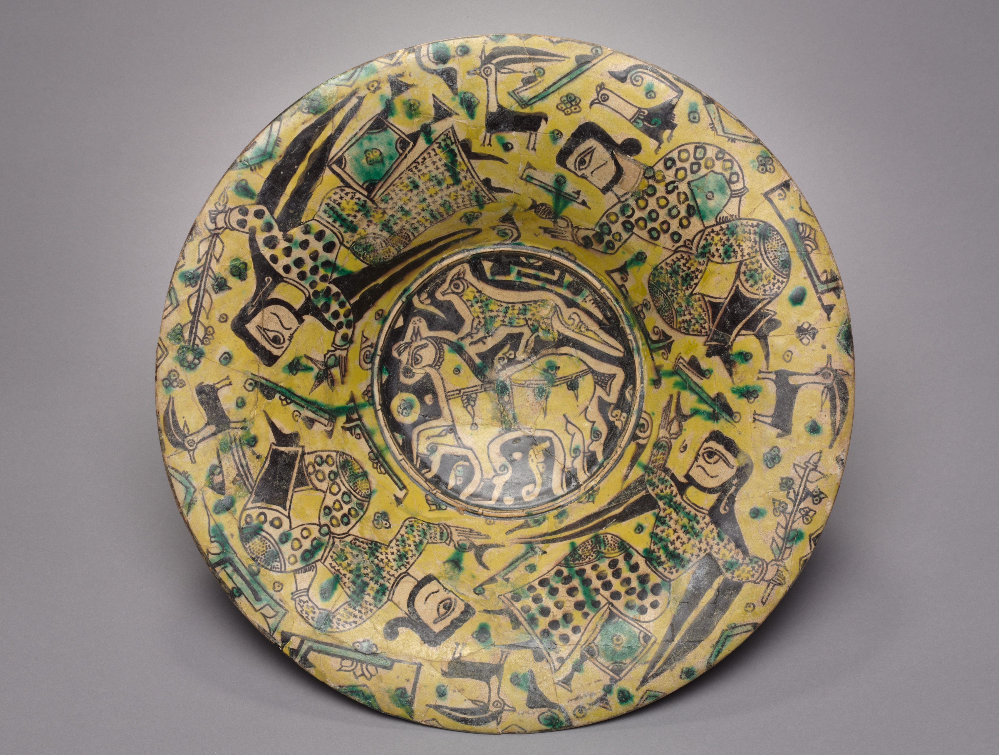 The Nishapur Figural Bowl by artist unknown, features a yellow ceramic bowl with a wide mouth and a flat base. The bowl's interior is decorated with a variety of designs and figures. The center of the bowl contains a circular design featuring a black and white illustration of an animal, possibly a deer or a goat, surrounded by decorative patterns. Radiating from the center are various figures and motifs, including people in traditional clothing, animals such as deer and birds, and abstract shapes. The bowl's interior background is predominantly yellow, with accents of green and black used throughout the design. The overall effect is one of intricate, detailed decoration that showcases the artisan's skill and craftsmanship. The exterior of the bowl is not visible in the image. The bowl sits on a gray background.