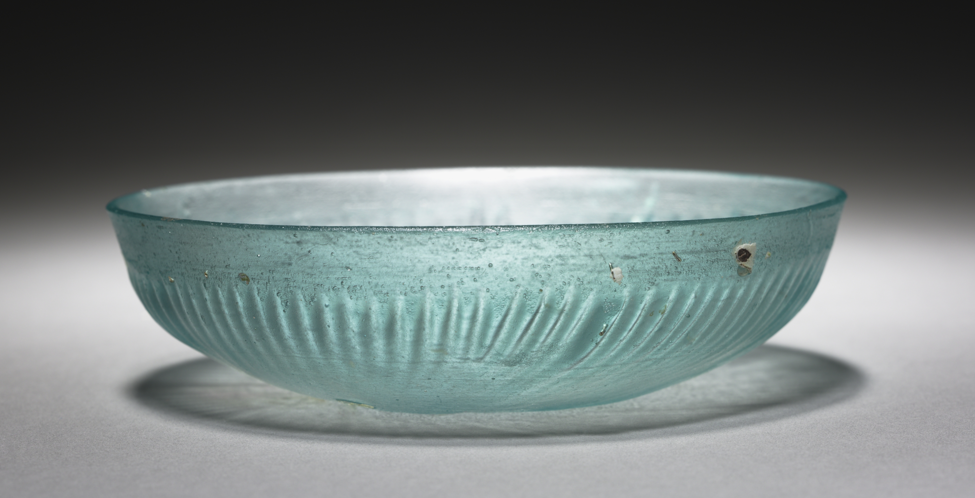 Shallow ribbed bowl by artist. The bowl is made of light blue-green glass and features a ribbed exterior. It has a wide, shallow shape with a rounded body and a flat rim. The glass appears to be semi-transparent and has a smooth, glossy finish. The bowl sits on a flat surface, casting a shadow underneath. The background is a gradient of dark to light gray.