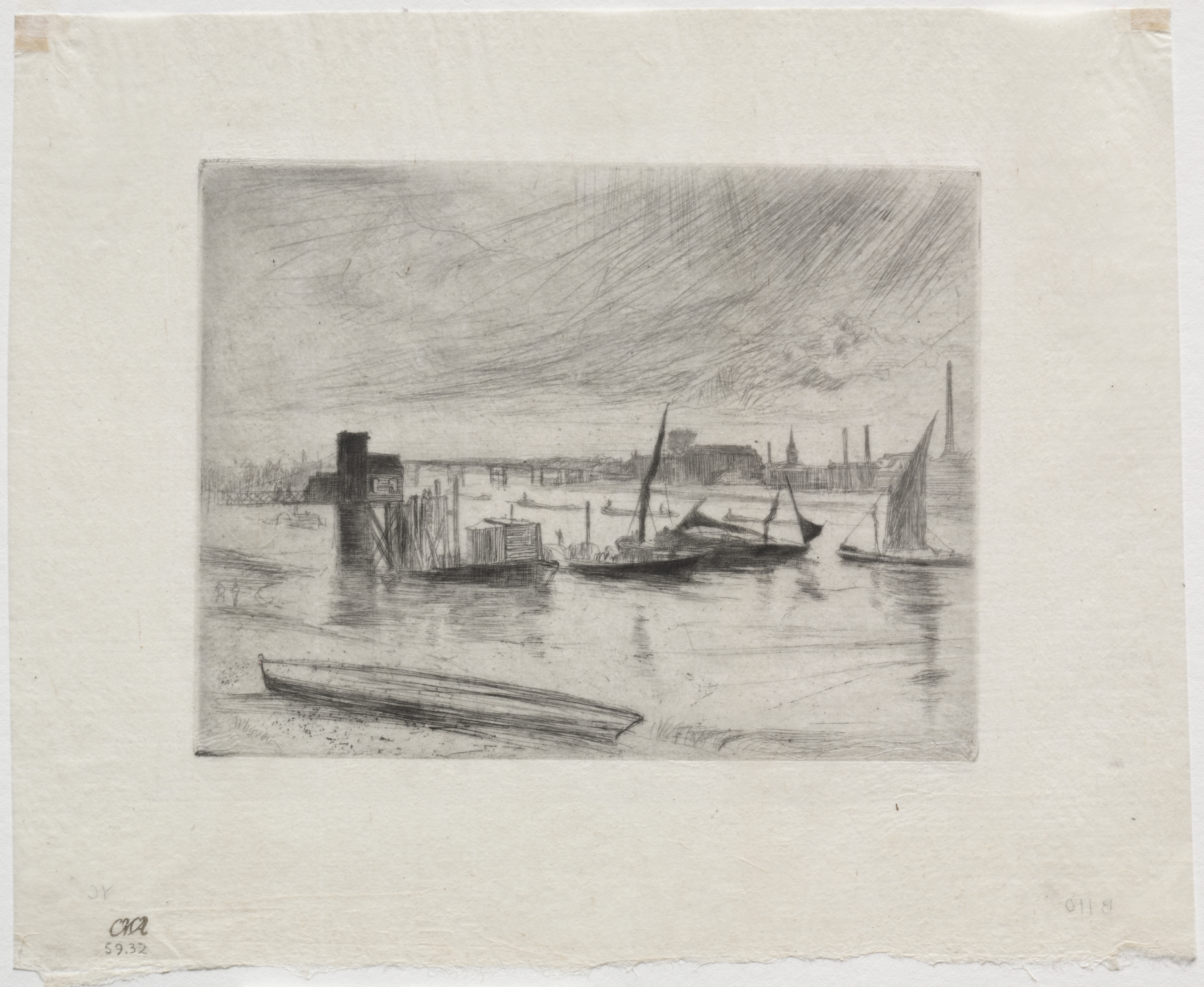 The image is a black and white sketch of a harbor scene. A small wooden boat sits in the foreground, water surrounds the boat. Behind it, there are several larger boats docked in the harbor. The boats have masts and appear to be sailboats or ships. In the background, there are buildings and structures along the shore, including what appears to be a dock or pier. The sky above is cloudy and overcast. The image is titled "Early Morning, Battersea" and is drawn by James McNeill Whistler.