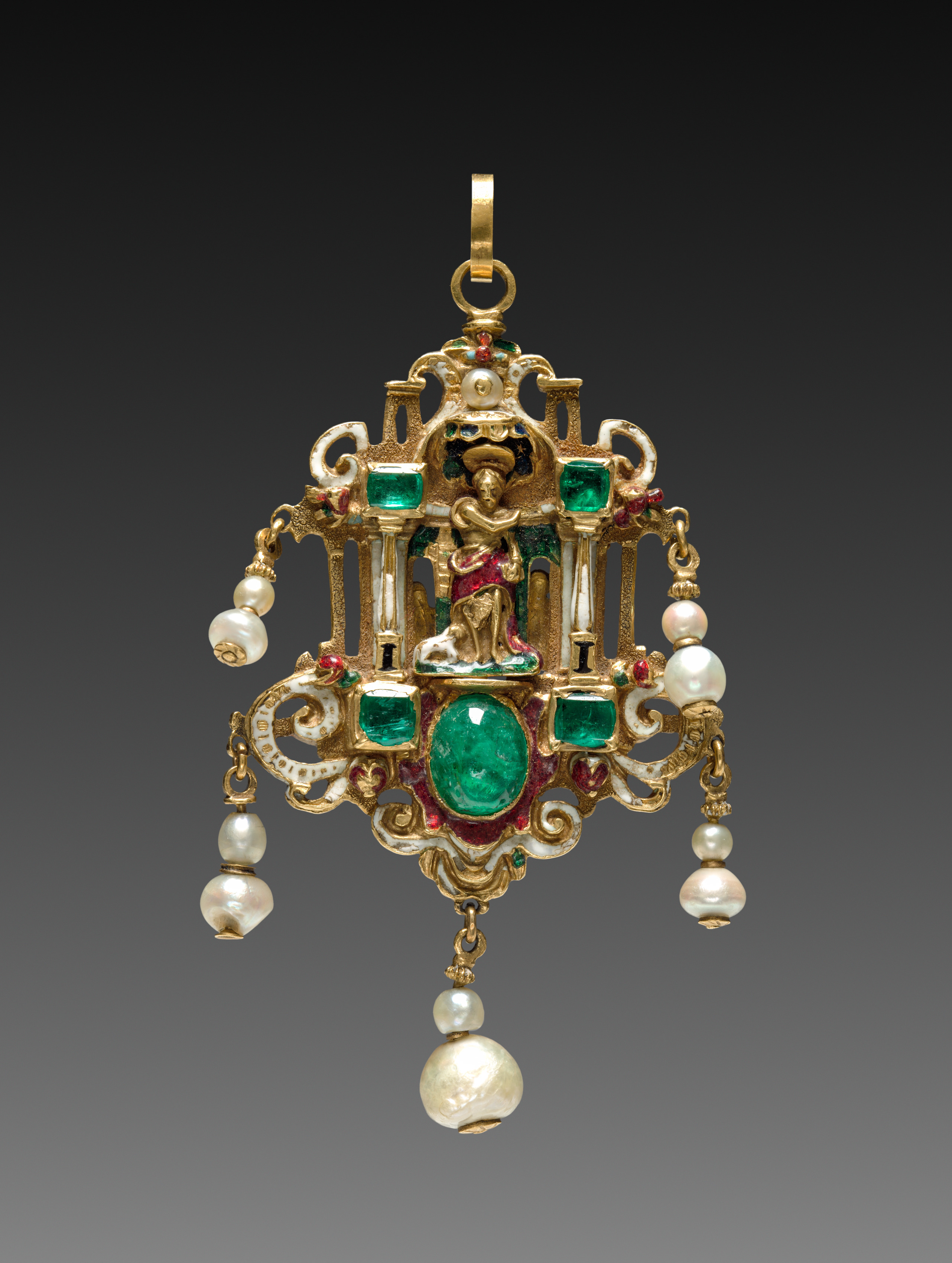 Gold pendant in the shape of a shrine with a figure of a man with a halo and a book; he wears a red mantle over a long robe; there are four columns; the figure stands on a large green gem and is surrounded by more green gems; red gems are embedded along the border; pearls hang from either side and the bottom; gold bail at top. Pendant with Saint John the Evangelist.