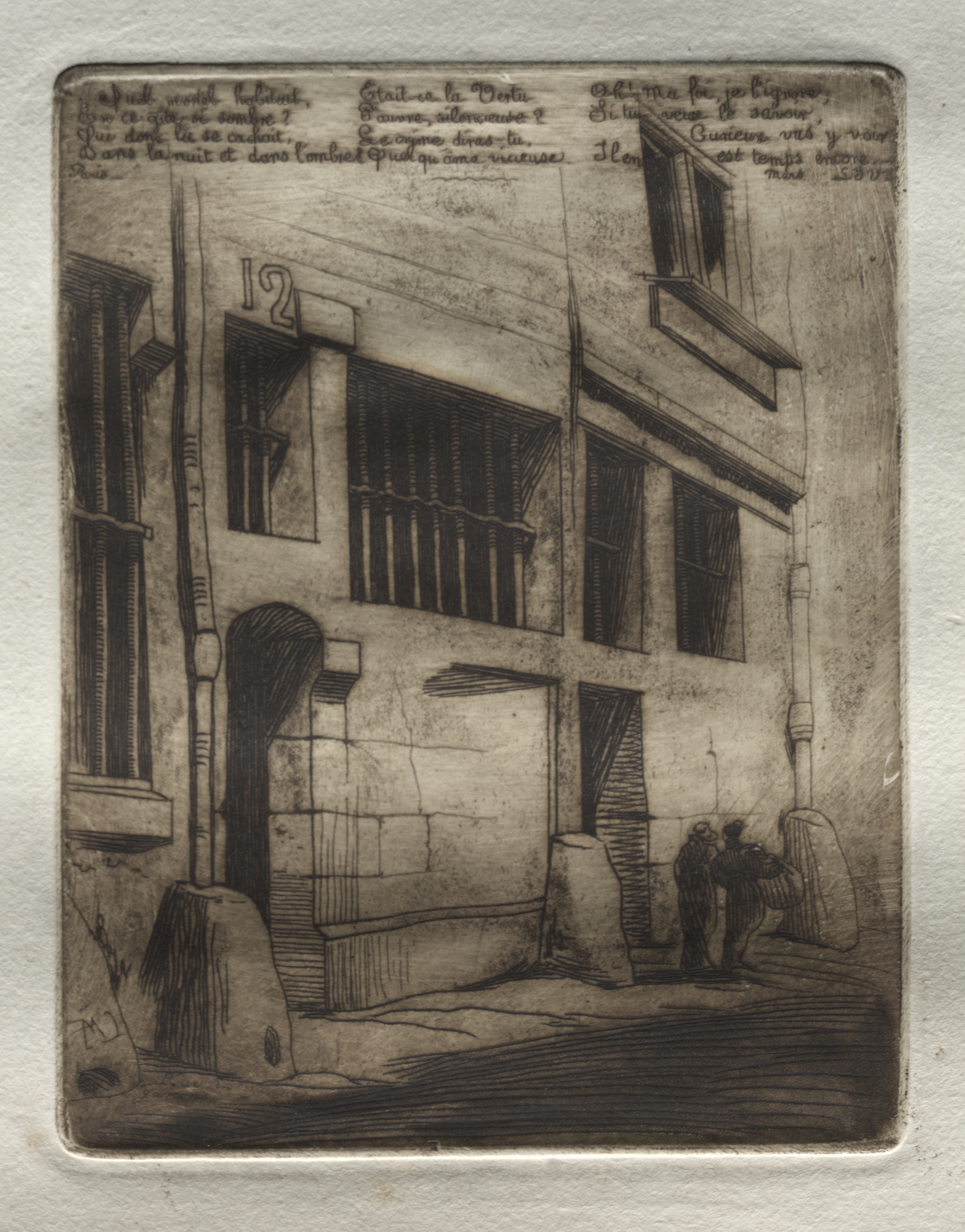 La Rue des Mauvais Garçons by Edmond Gosselin: A grayscale etching of a two-story building corner with a street. The building has a stone foundation, with a dark archway leading to a door on the ground floor, and several windows on both floors. A number "12" is visible on the upper part of the building's corner. Two people stand on the street in the lower right corner. The image has a thin border and is set against a textured white background. Cursive writing is present at the top.