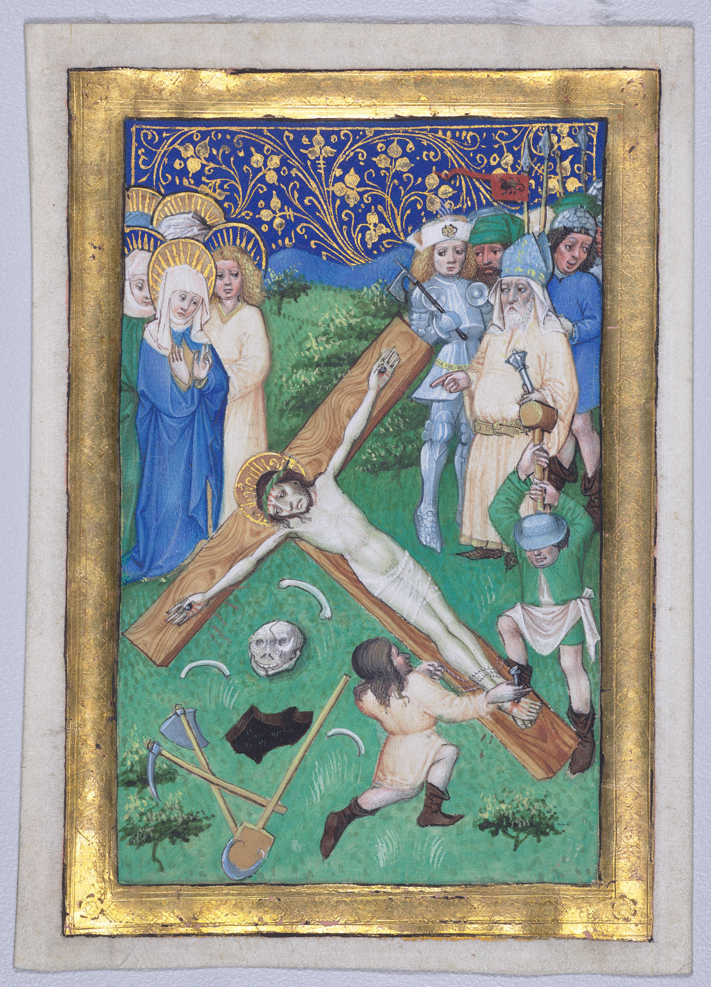 Gold framed artwork depicting Christ being nailed to a cross. Christ lies on a brown cross on green grass with arms outstretched. A man wearing brown boots, white pants and green shirt and hat hammers at the bottom right of the cross. A skull and crossed pickaxe and shovel are on the ground to the left. Three onlookers to the left wear blue and white and have golden halos. Two men on the right wear armor and hold hammers. A blue and gold design is at the top. A gray background surrounds the frame.