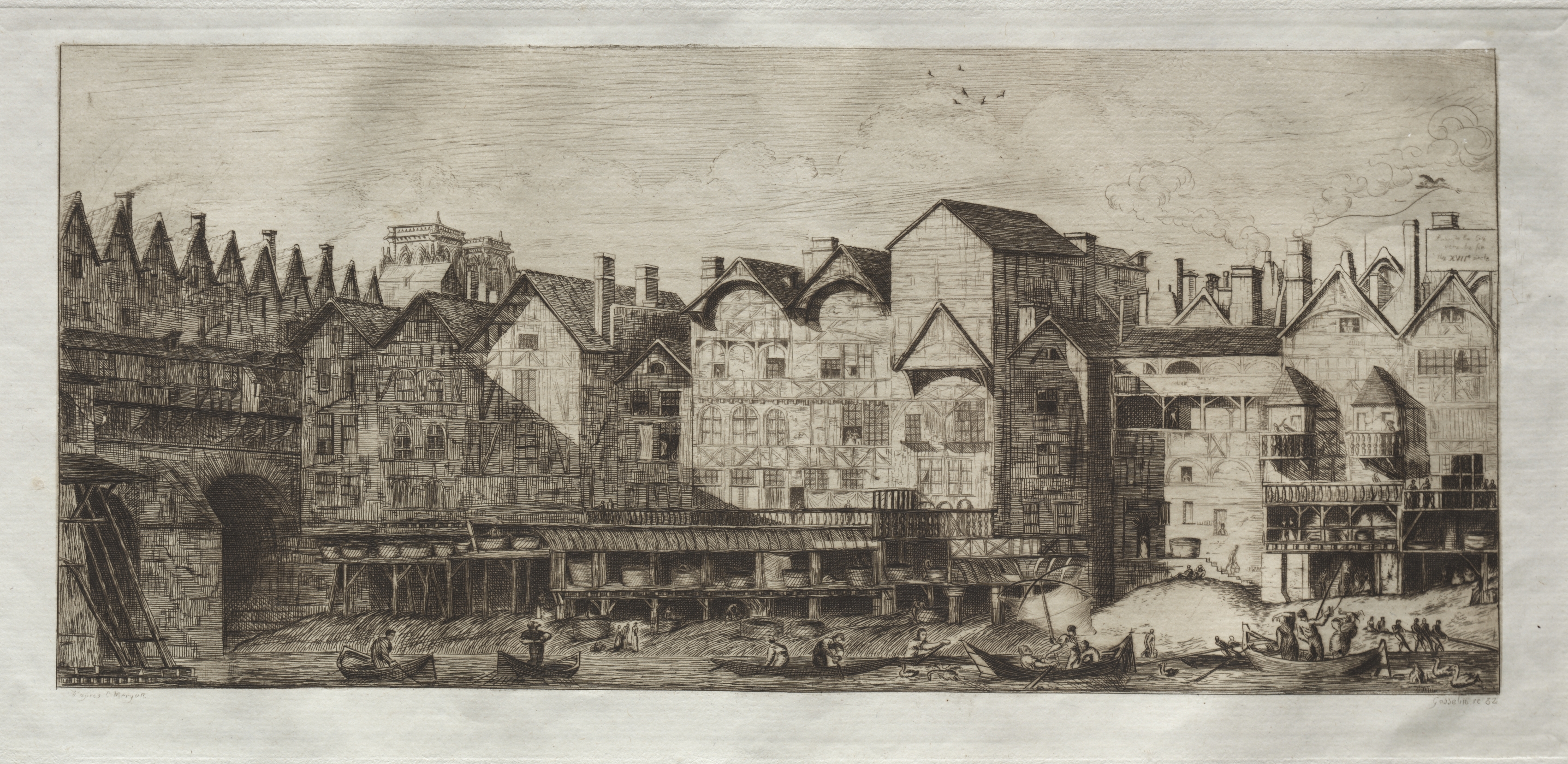 Black and white etching of a riverside cityscape. The scene is set in a European-style city with densely packed buildings. The buildings have steeply pitched roofs and multiple chimneys. Some buildings have balconies and ornate facades. A river runs through the foreground, with several boats and people. A bridge or archway is visible on the left side. The sky above is cloudy with birds flying.