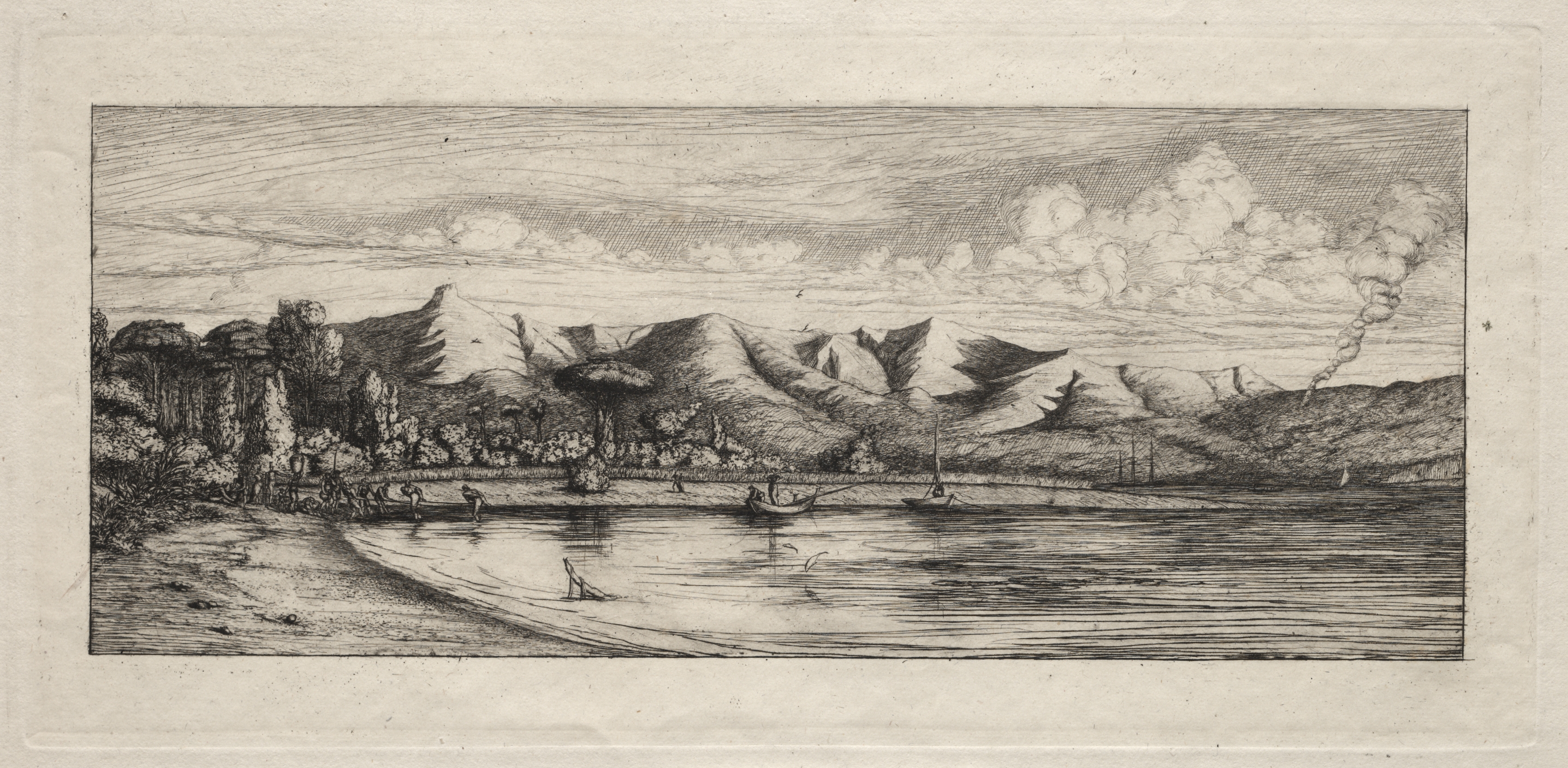 Black and white image of a landscape. A body of water fills a large portion at the bottom with two small boats. Mountains are in the background. The shore on the left has trees and three people. A beach-like area on the left leads down to the water. The sky has lines suggesting wind and large clouds.