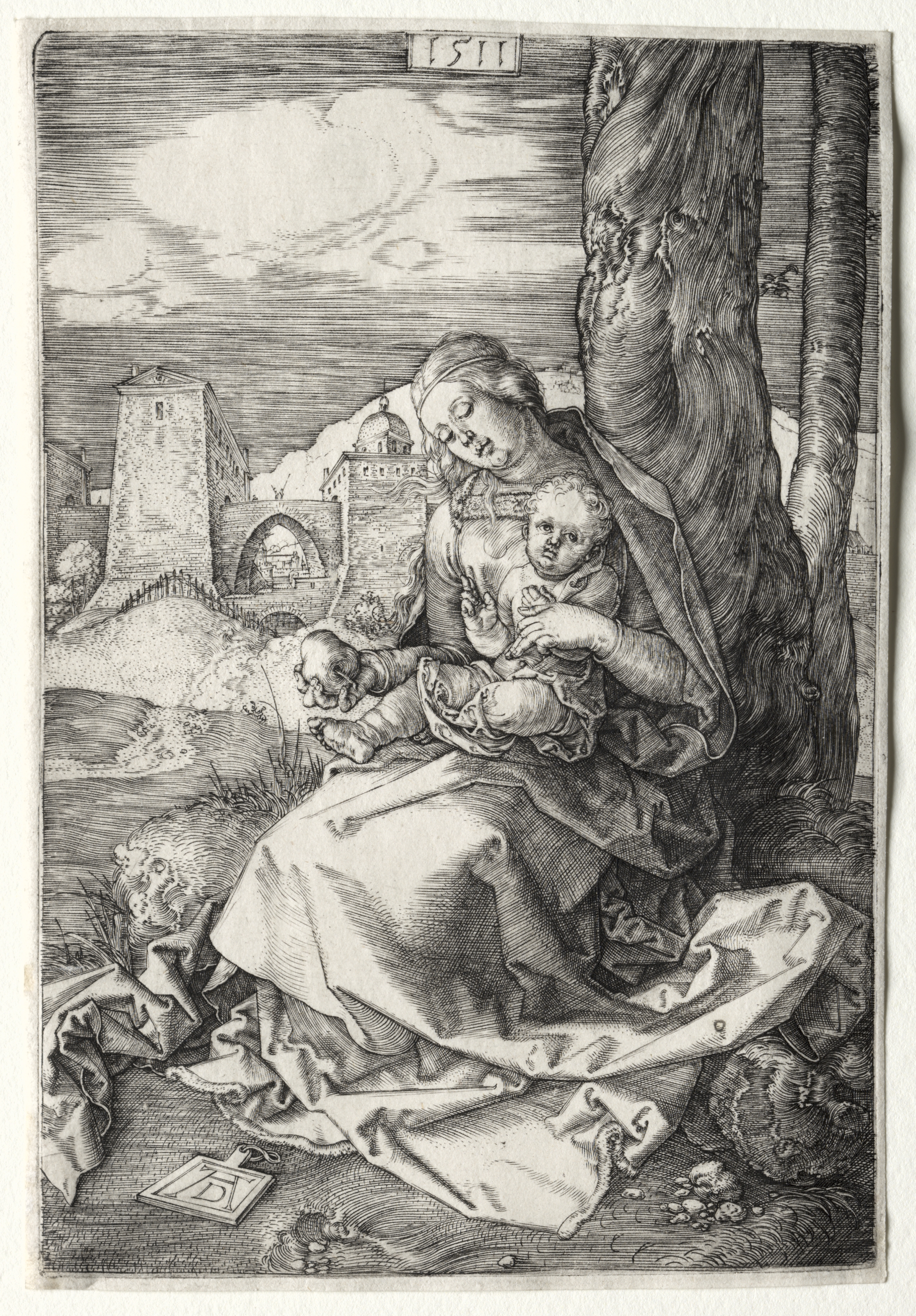 The Virgin Mary sits on the ground with her back against a tree trunk, wearing a long dress and a head covering. She holds the Christ child on her lap; the child sits upright and looks forward. The Virgin's head is bent down towards the child. A skull lies on the ground to her right, and an open book is on the ground to her left. In the background, there is a bridge and a tower on the left side, and a large building with a dome. The sky has several clouds. The image is in black and white.