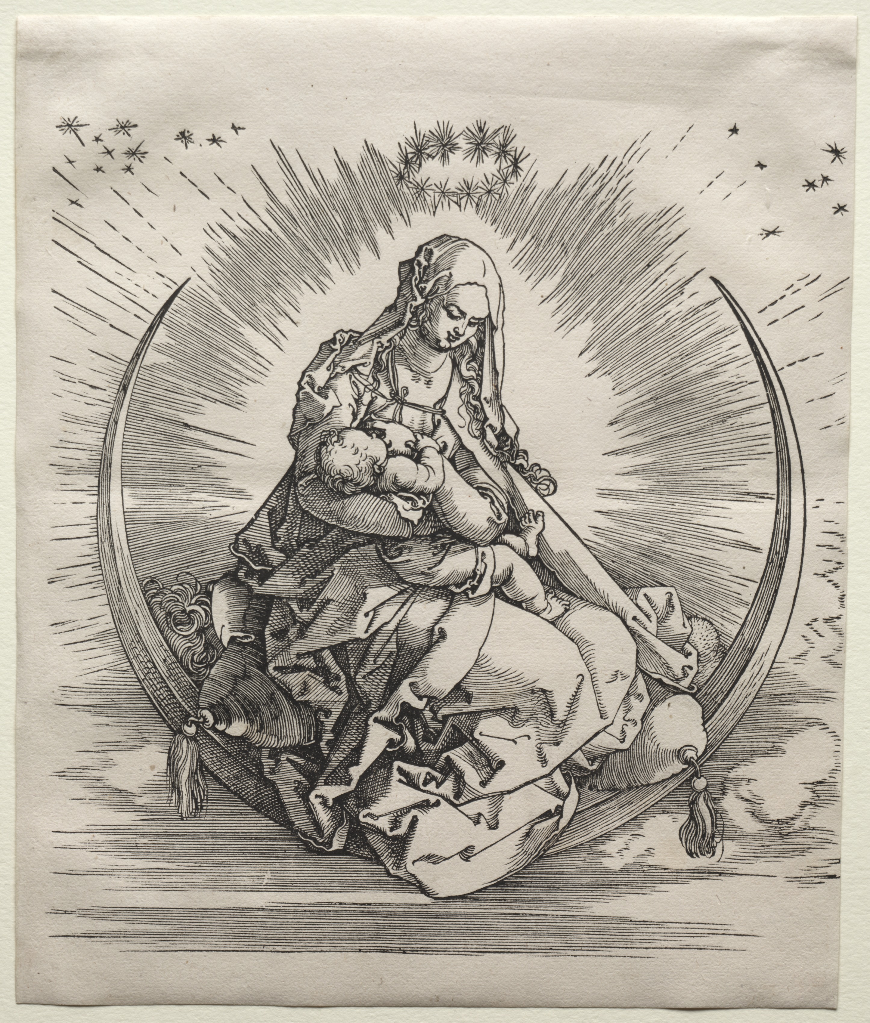 The image depicts a black and white drawing of the Madonna and child. The Madonna sits on a crescent moon, which has a tassel at the bottom. She wears a head covering and a dress. Her right arm supports the child while her left arm guides the child's hand to her mouth. The child appears to be naked. The Madonna and child are surrounded by lines radiating from behind them, indicating light. There are stars in the sky around them. The Madonna looks down at the child. The overall composition suggests a religious scene. The style appears to be detailed and intricate, characteristic of Albrecht Dürer's work.