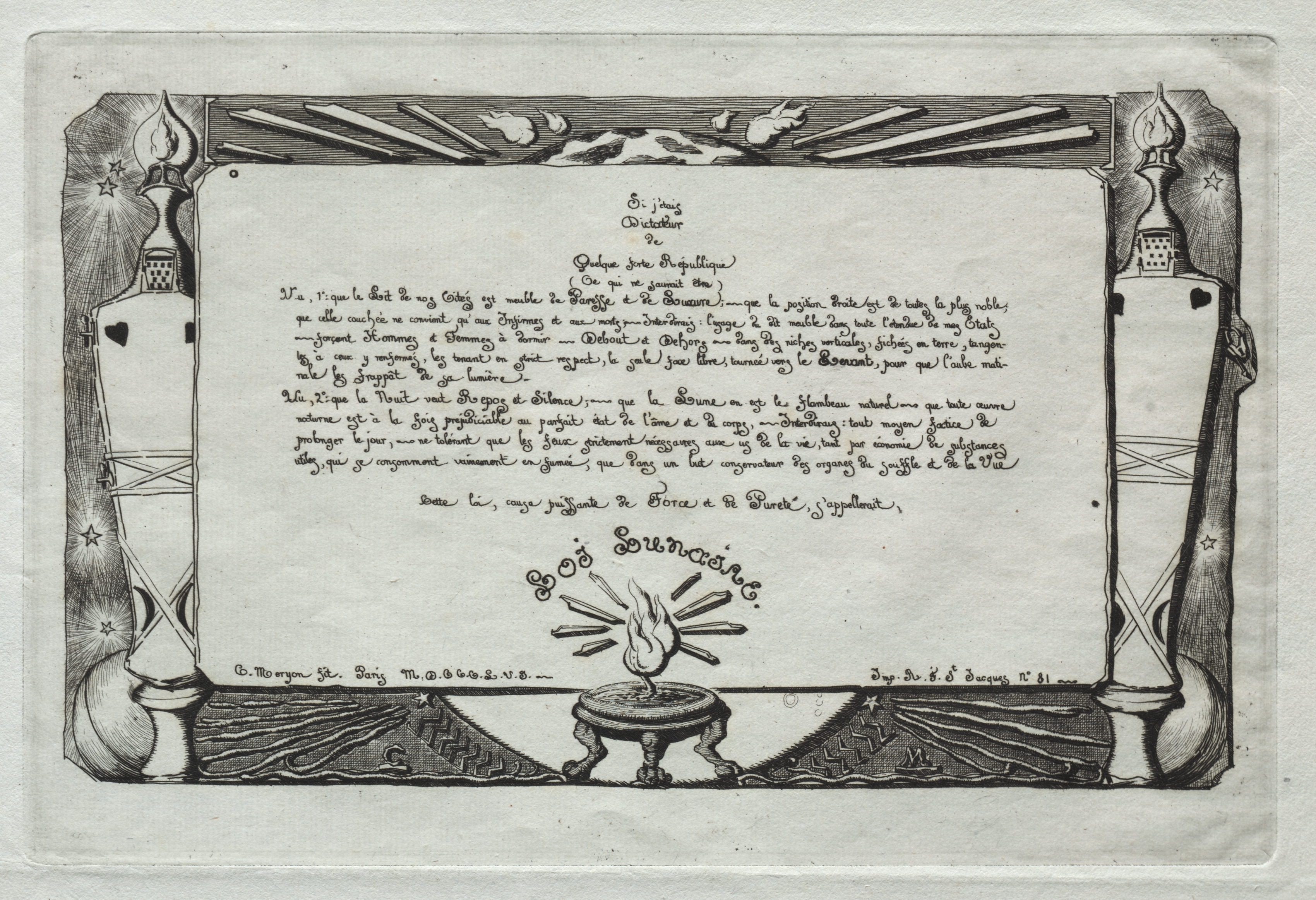 Black and white drawing of a framed piece of paper with writing on it. The frame has a border with two candlesticks on either side. A flame with rays emanating from it sits at the bottom. The flame is surrounded by the curved text "SOLEIL ETOILE". The flame sits on a pedestal with three legs. The words are written in cursive. The frame border has starbursts with stars in them. There are rays behind the stars. The frame border has a sun and moon on top. At the bottom of the frame border are wavy lines resembling hills. There is a signature and illegible text at the bottom of the border. The background behind the frame is plain.