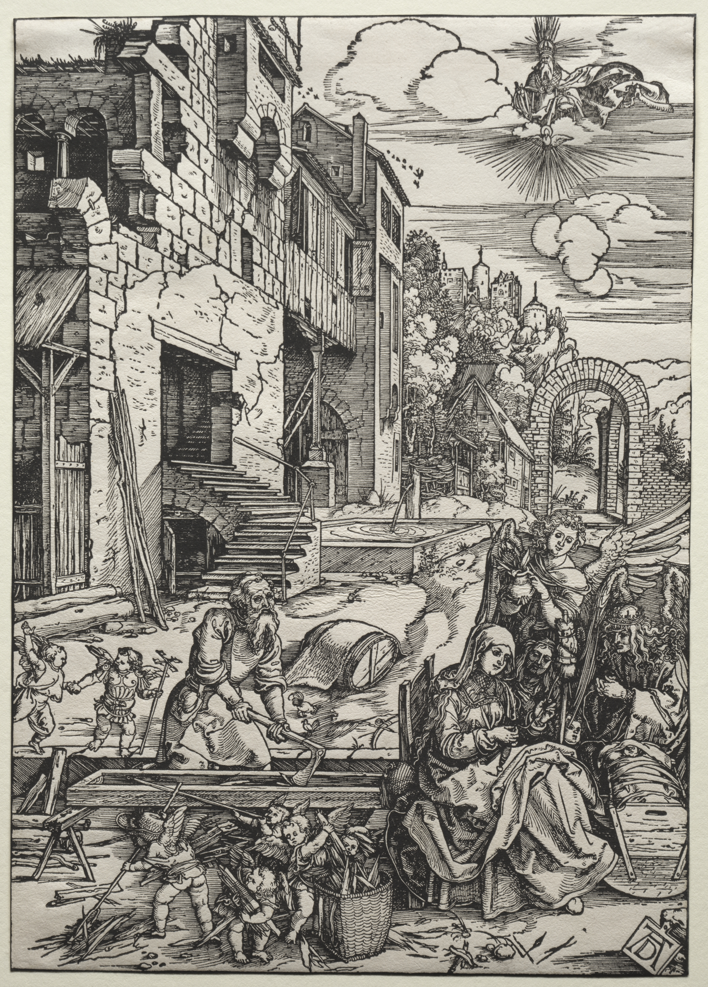Black and white drawing of a scene with a woman sitting, possibly in prayer. A man and a donkey nearby. Several children; some playing near woman. Large stone building on left with staircase. Arched opening on right. Angel flying above.