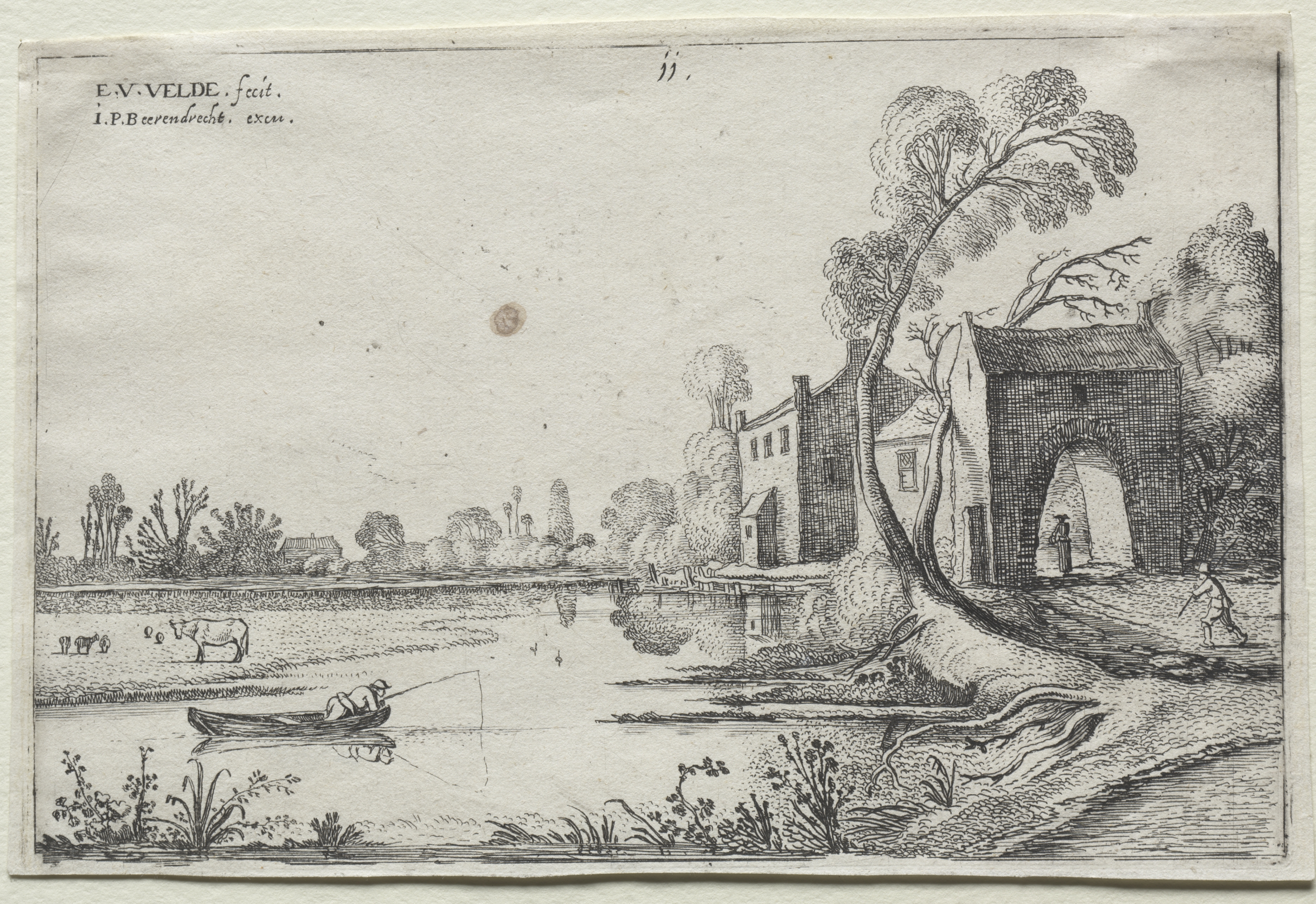 Black and white drawing on light gray paper, thin black line border. A river runs across the bottom half. A figure rows a small boat on the river. A cow and three calves graze on the left bank. A large tree grows at an angle on right bank. A stone gatehouse on right with an archway and a person standing under it. A man walks on road to the right of gate. A row of buildings stretches along the river on the right. Trees line horizon. Text in top left corner: "E.V.VELDE . fecit. I.P.B.cocrndrechr. excut."
