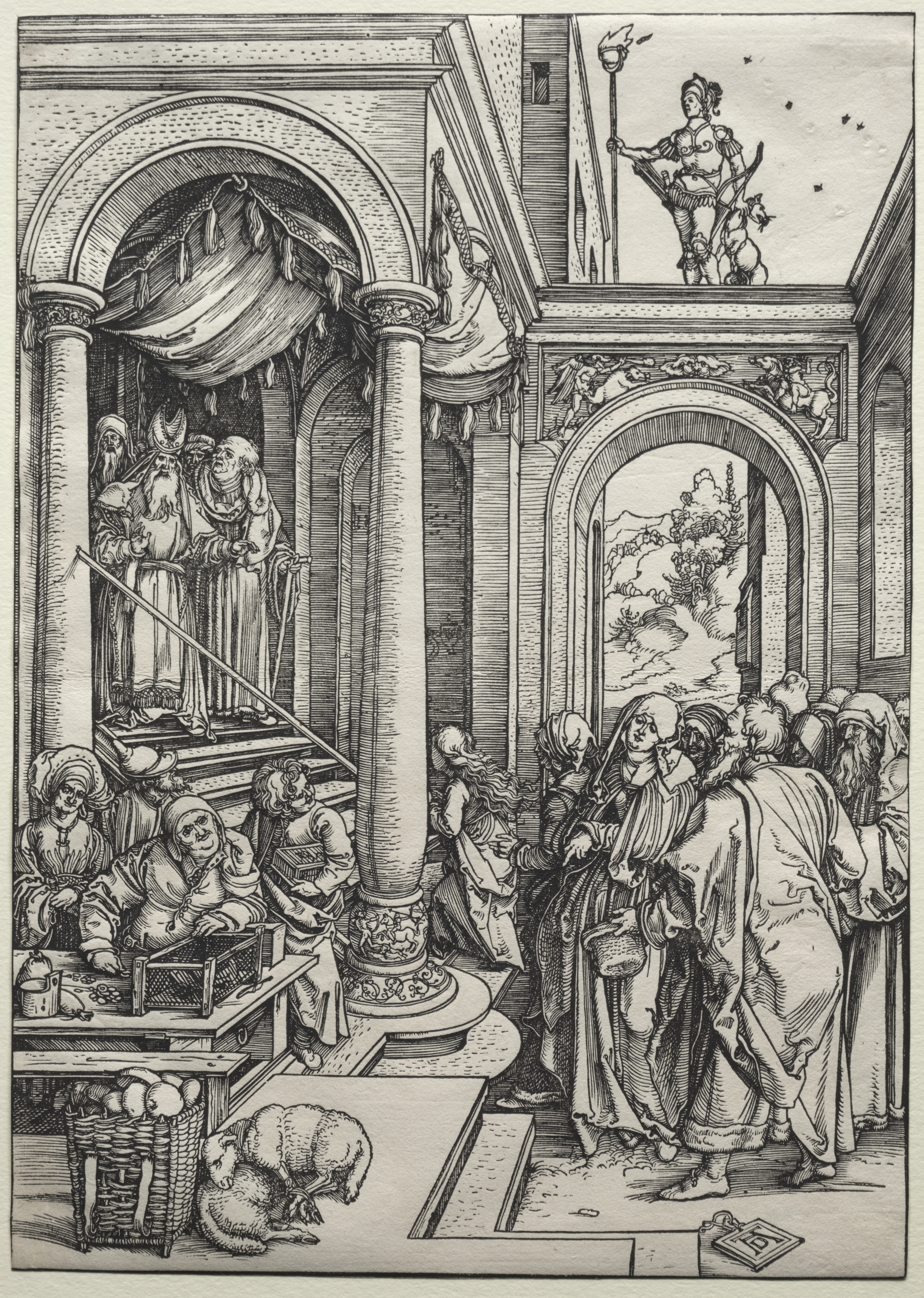 Black and white engraving depicting a scene set in an architectural interior. The scene features a large group of people in old-fashioned clothing gathered around a young girl. The girl stands on steps flanked by columns beneath an archway; she is surrounded by older women and presents a book. The interior includes stone columns, arched doorways, and a statue on a pedestal above. In the foreground, a dog is curled up beside a basket of objects. The background shows a glimpse of outdoor scenery through a window. The entire scene is highly detailed with many lines and shading. The title of the work is "The Presentation of the Virgin in the Temple" and it is by Albrecht Dürer.
