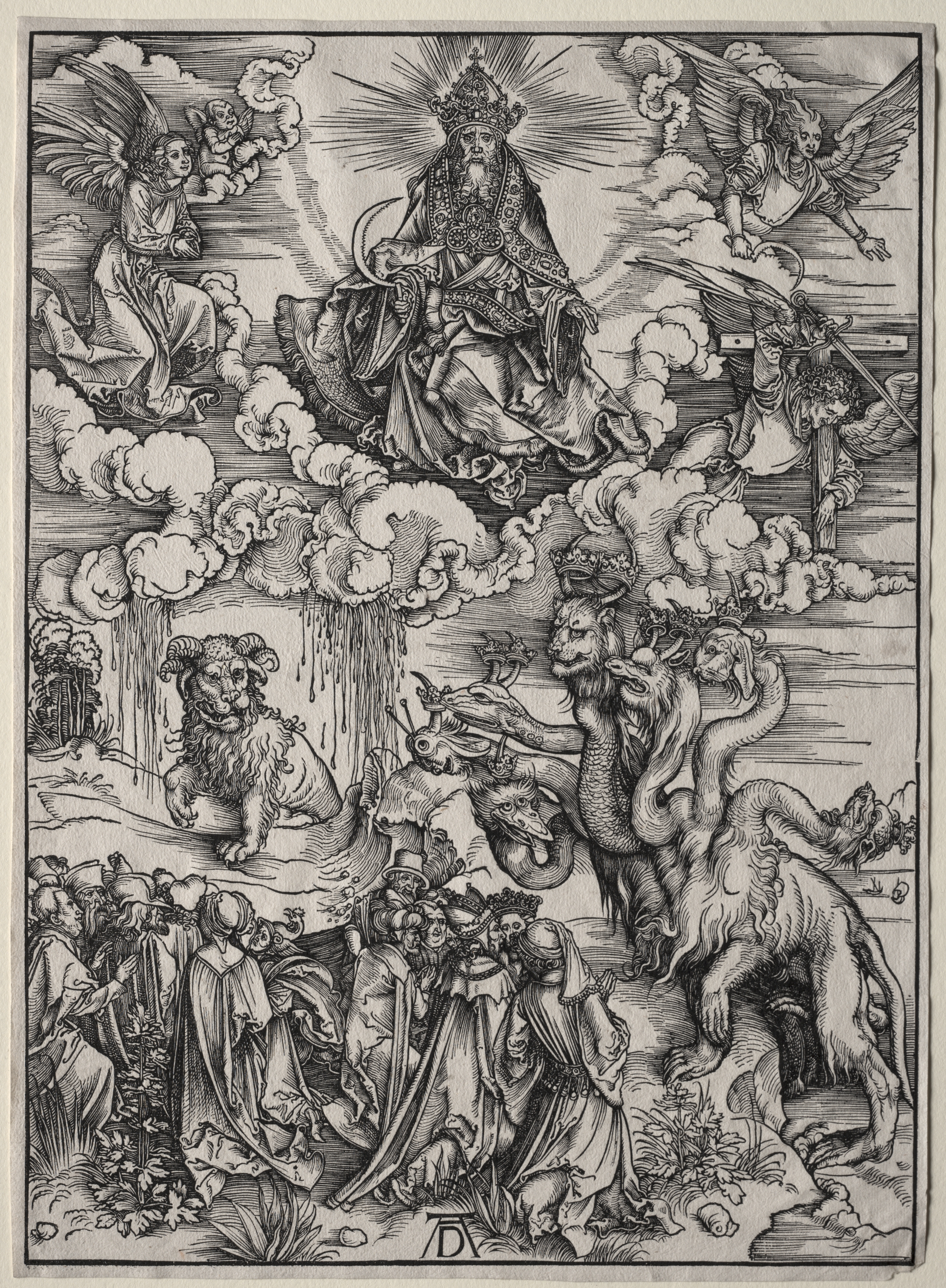 Black and white illustration depicts a religious scene with multiple figures. The top half shows a bearded king with a crown on a throne, wearing a robe with a patterned cloak, surrounded by a halo of lines. Four angels with wings are positioned around the king. The bottom half depicts a chaotic scene with several people on the ground. Two fantastical beasts are present: one with seven heads and the other with two horns like a lamb. The seven-headed beast has the body of a lion, with seven heads, some resembling a dragon or serpent. The lamb-horned beast resembles a lion with long hair. The background features clouds and rays of light emanating from the king. The illustration is detailed with shading and textures, in a style characteristic of old master prints. The image is framed by a border.