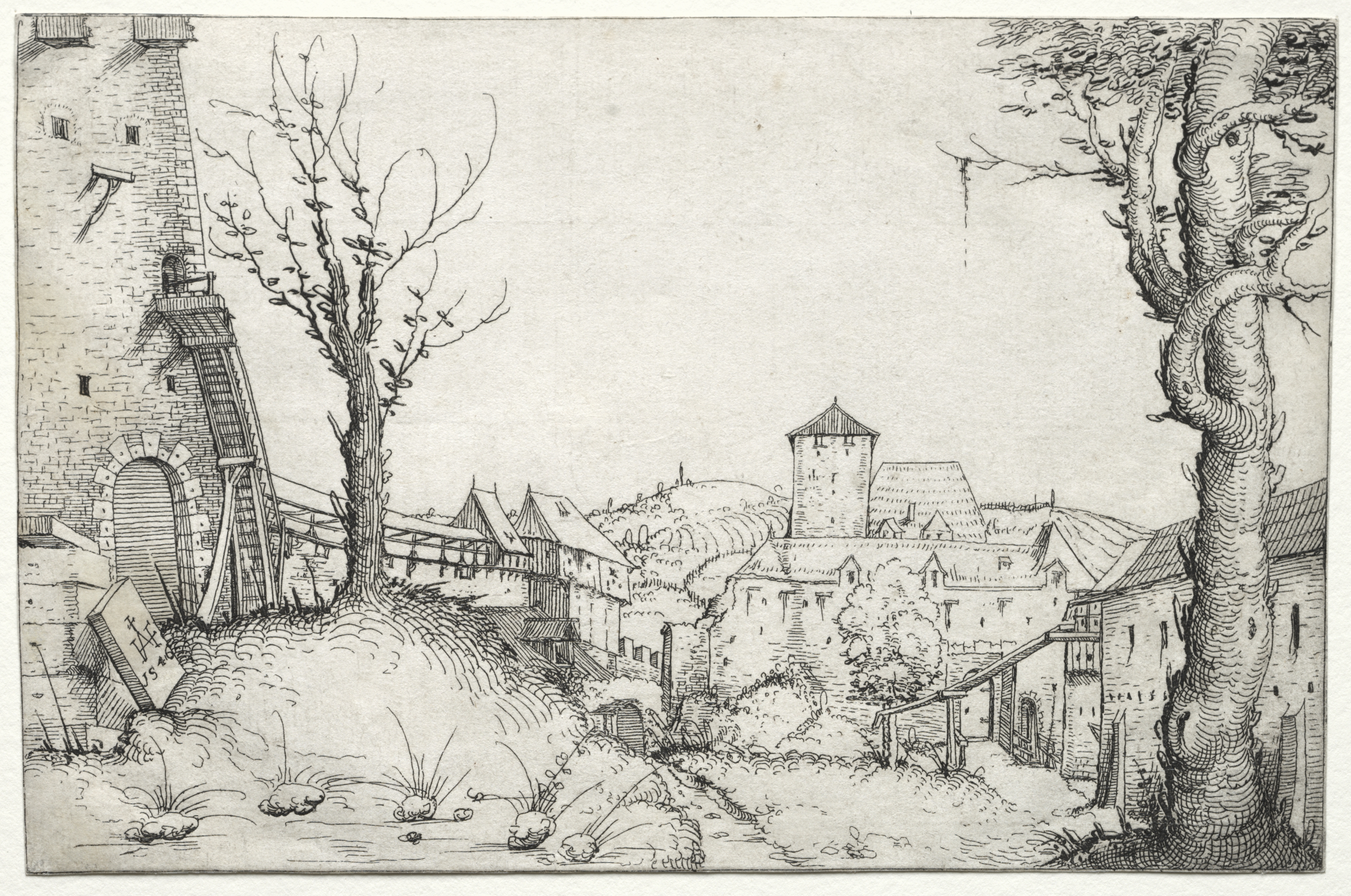 Black and white drawing of a courtyard surrounded by buildings. The courtyard contains a tree with no leaves on the left side and a tree with leaves on the right. A tall brick wall with a tower on the left. A bridge runs over an archway in the wall. A large tree trunk is on the right side. The buildings are mostly made of stone and have roofs. The background shows more buildings and a clear sky. The drawing is done by Augustin Hirschvogel.