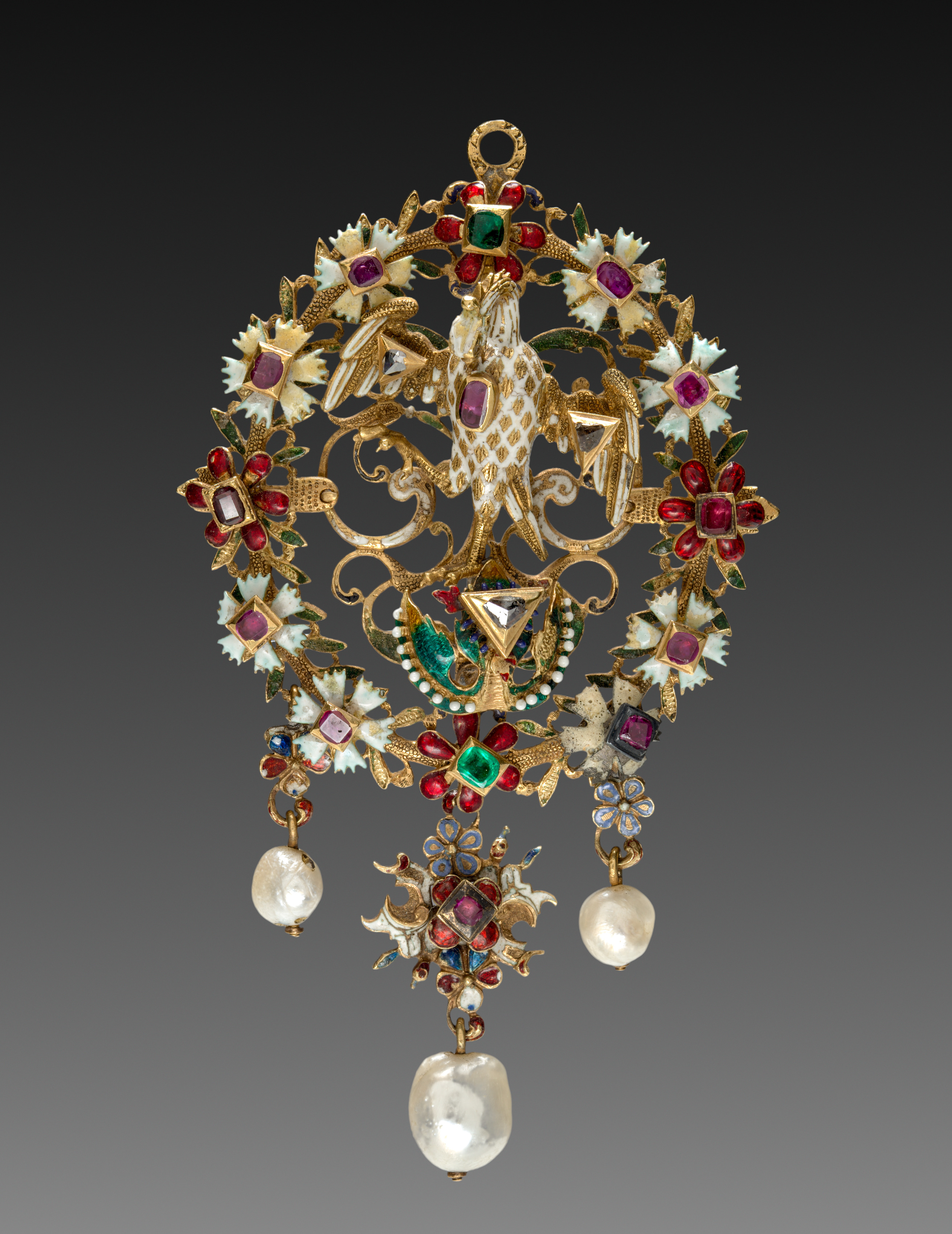 Gold pendant in the shape of a pelican. The pendant has a circular top with a gold pelican in the center and a gold loop at the top for attachment. The pelican is surrounded by a wreath of white flowers with red centers. The wreath is adorned with clear, red, green, and purple gemstones. Three pearls hang from the bottom of the pendant. The background is dark gray, transitioning to light gray at the bottom.