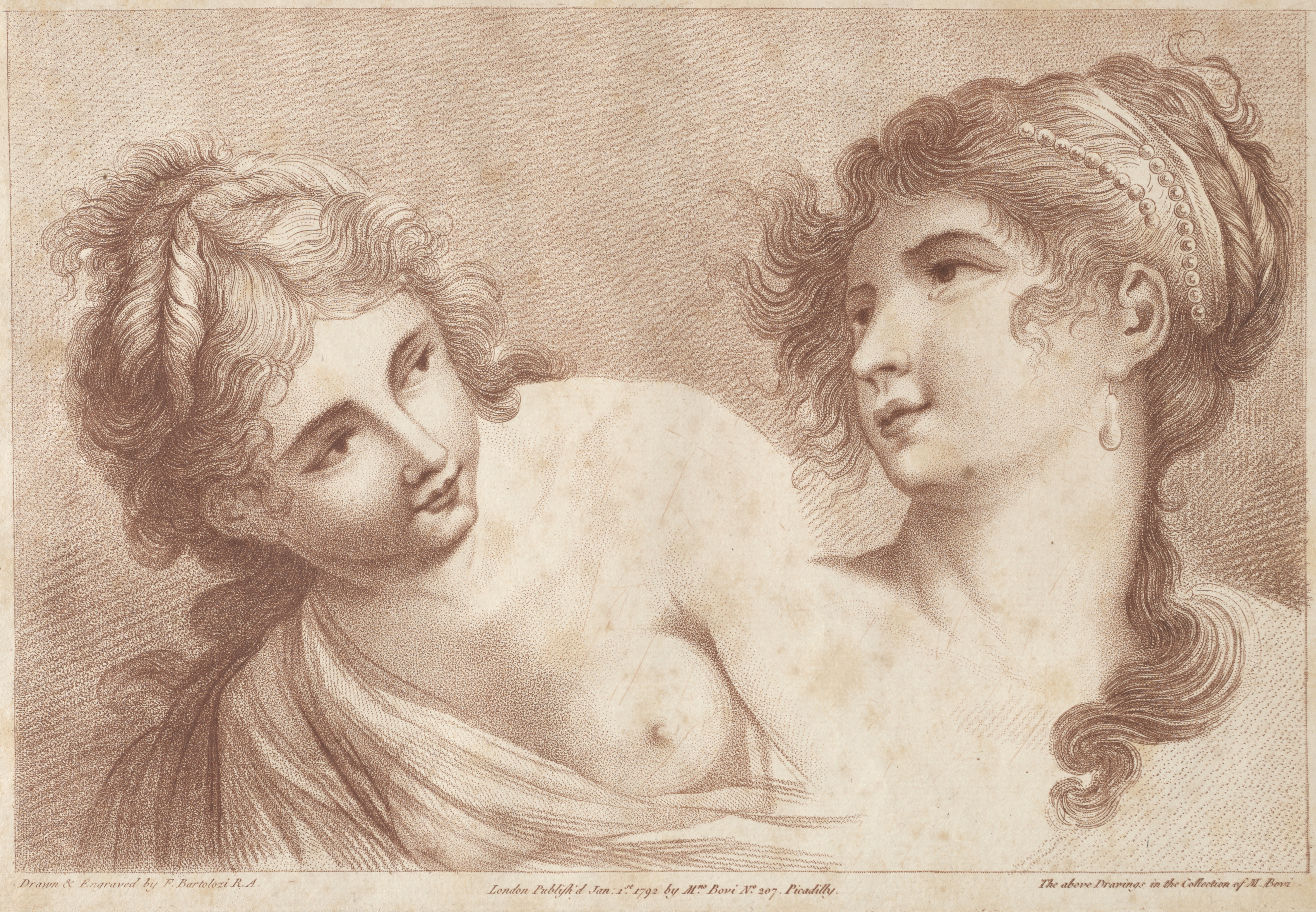 Two women's heads in profile. The woman on the left faces right. She has curly hair, a cloth draped over her right shoulder. The woman on the right faces left, has longer wavy hair with a headband of pearls, and a single pearl earring. Both have pale skin. The image is a sepia-toned drawing with detailed lines and shading.