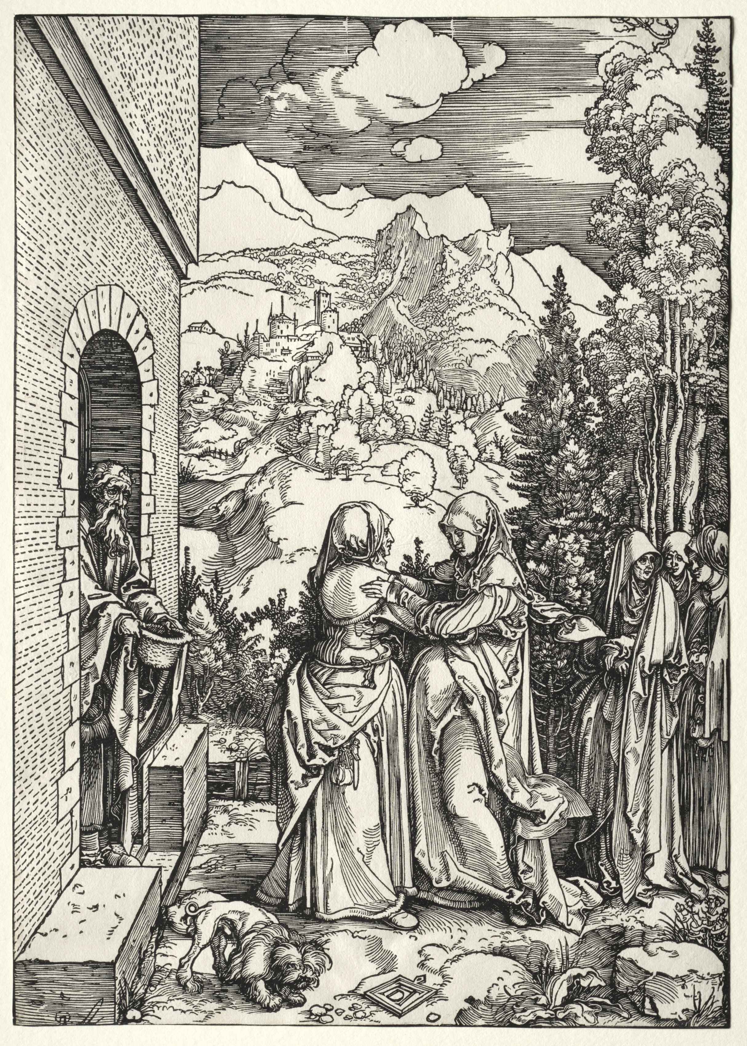 Black and white engraving of a scene with several people outdoors. Two women in head coverings and robes embrace in the center. One woman stands on the right with a piece of paper in her hand. A man stands in an arched doorway on the left. A dog sniffs the ground near the foreground. Trees and a mountainous landscape are in the background under a cloudy sky. A town is nestled in the mountains. A stone building is on the left.