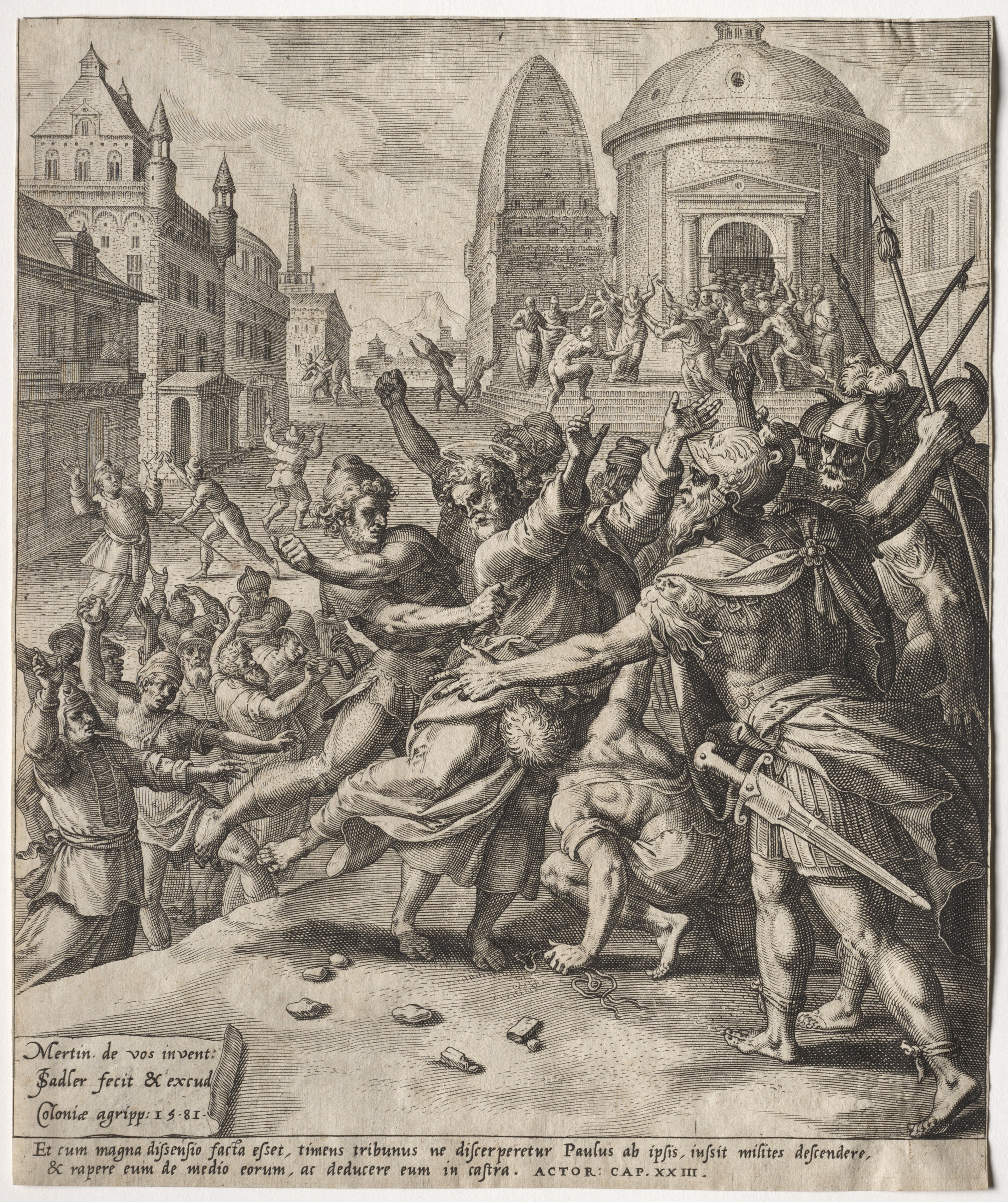Black and white image, a chaotic scene depicts a group of men in ancient clothing. A man with long hair and beard wearing a long tunic and barefoot is being restrained by a group of people. A man in a helmet and armor holds a long spear and grips the arm of the man in the tunic. Other men are running or fighting in the background. A cityscape with buildings and a large domed structure is in the background. The sky is cloudy. A block of text is in the lower-left corner.