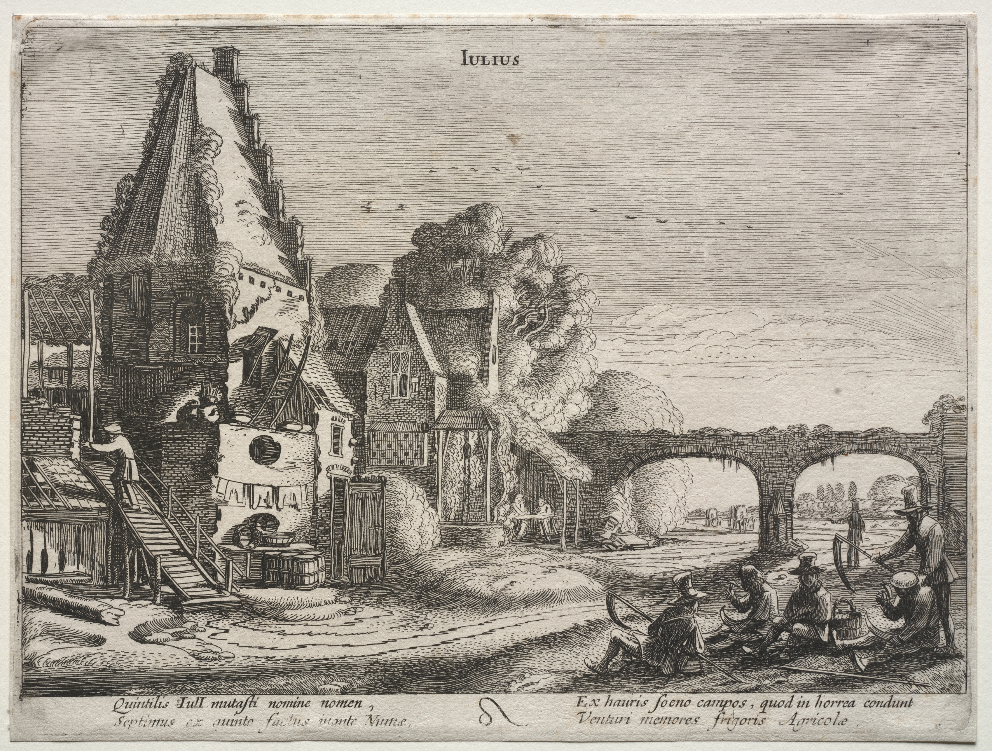The image is a black-and-white etching depicting a scene set in July. A river runs through the center with a short stone bridge on the right side. On the left side, there are brick buildings with steeply pitched roofs; one building has a very tall, triangular roof. The foreground on the right features a group of people resting and working near the riverbank. The sky is filled with lines suggesting texture or movement. The word "Iulius" is written at the top center. There are lines of text at the bottom. The overall scene depicts a rural or village setting with people engaged in activities near a body of water.