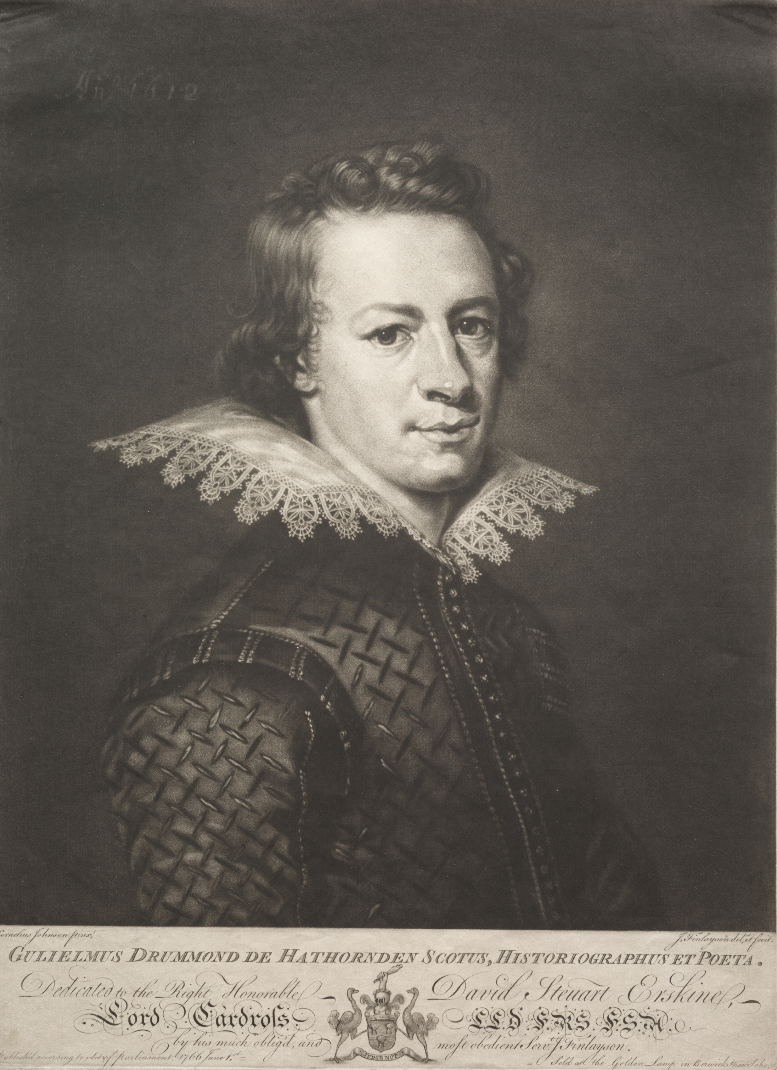 Black and white portrait of a man. The man has curly hair and a mustache. He wears a large white lace collar and a patterned jacket. The jacket has a woven texture on the sleeves and upper chest area. There is a strip of paper at the bottom with writing on it. The writing on the paper includes the name "Gulielmus Drummond de Hathornden Scotus, historiographus et poeta". There is a crest or coat of arms on the paper. The background of the portrait is dark gray.