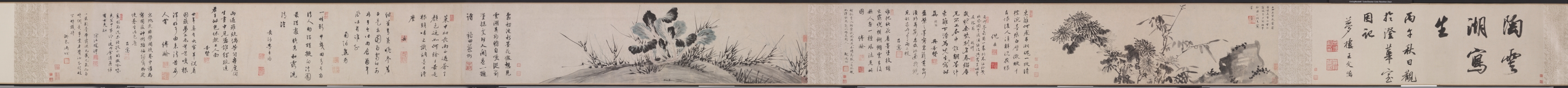 The image depicts a long, horizontal scroll with a light beige background. The scroll is divided into sections, featuring black Chinese calligraphy and artwork. On the left side, there are several lines of Chinese characters written in black ink. In the center of the scroll, there are two black and white artworks: one featuring chrysanthemums and the other featuring cabbage. The artwork on the left shows blue and white flowers with green stems and leaves. The artwork on the right shows green leaves and white cabbage. The right side of the scroll features more Chinese characters written in black ink, accompanied by several red seals or stamps.