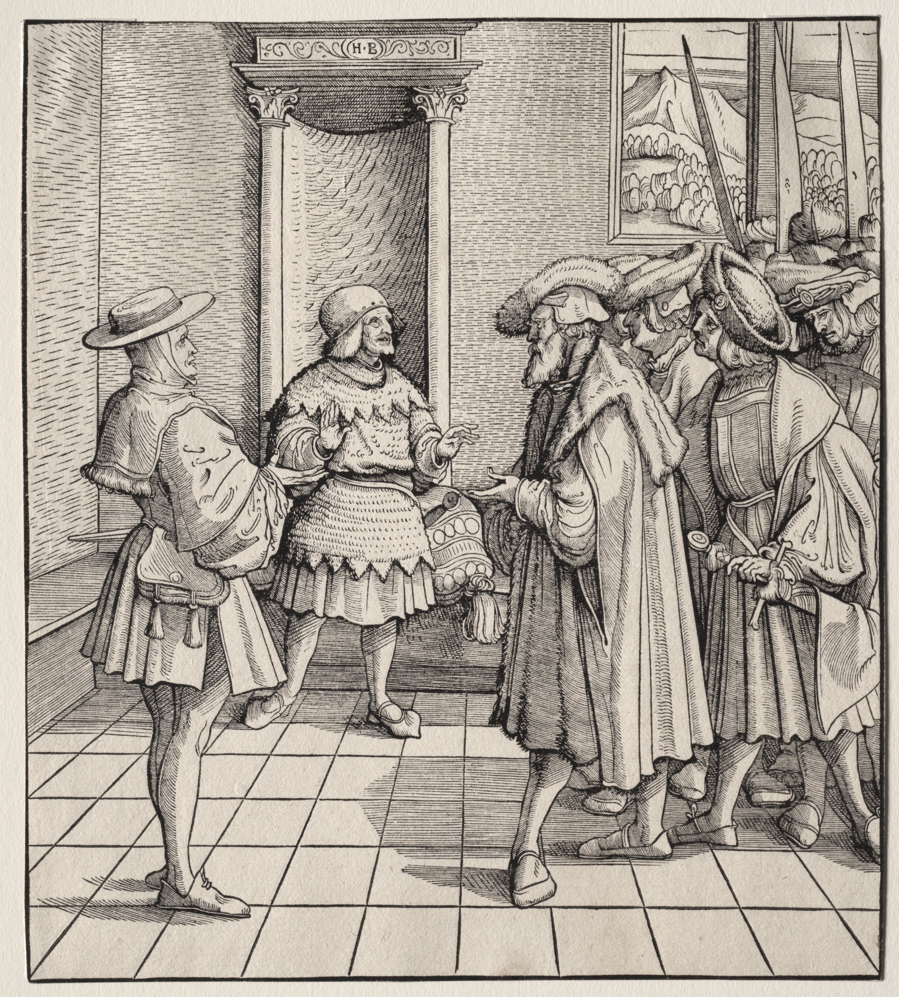 Black and white woodcut of a group of men in a room. A man on the left faces right, wearing a hat with a short brim and a puffy short-sleeved shirt with a gathered neckline and a short skirt. He has on puffy shorts and slouchy shoes. The man on the right faces left; he wears a fur-lined cloak over a long-sleeved shirt with puffy shoulders and a fur hat. He holds a dagger and looks down. Between them is another man facing left, wearing a helmet and holding armor. Two other men behind him wear helmets and carry swords. In the background is a tiled floor and a wall with a doorway. There is a framed picture hanging on the wall. The artist's signature is visible on the frame above the doorway. The image depicts a scene titled "The Bad Advice of One Little Man to Another."
