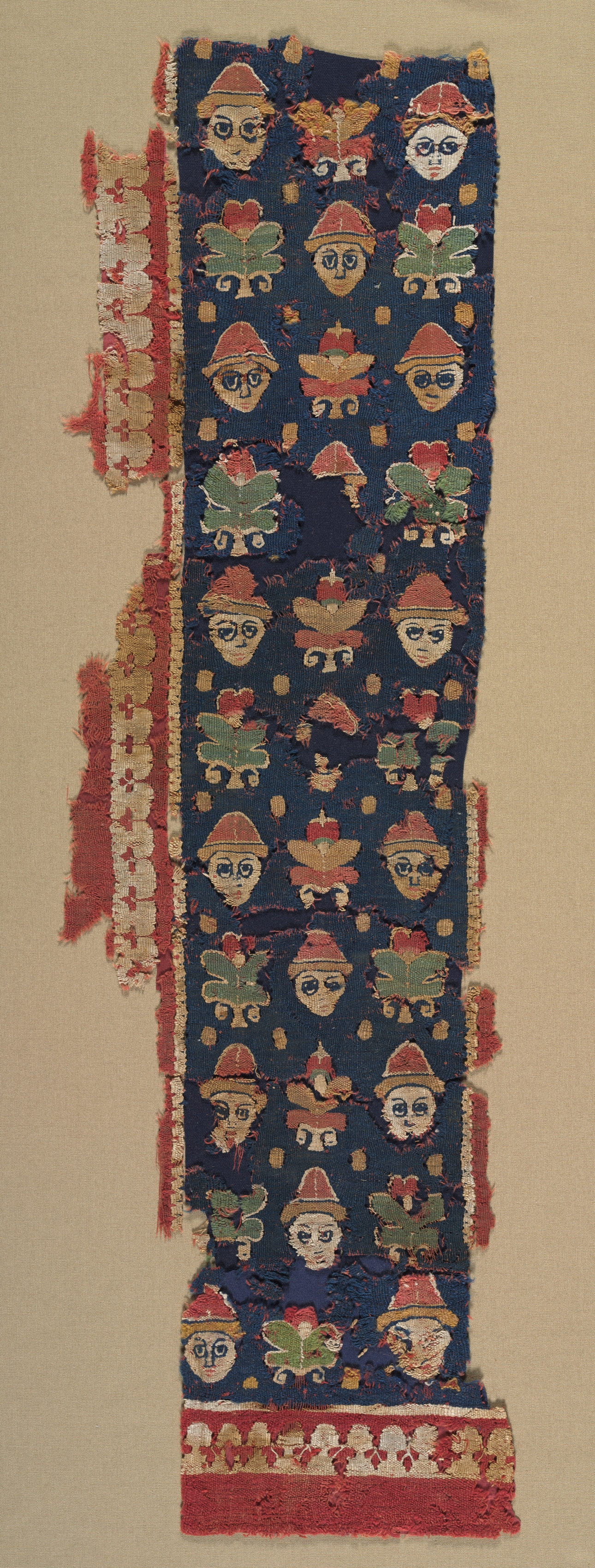 Narrow, vertical textile strip with frayed edges, primarily dark blue background. The strip features repeating pattern of 18 humanoid faces and 18 palmette designs in rows of 3. Faces have light skin, large dark eyes, and wear red and yellow hats. Palmette designs are green and red. Small gold squares scattered throughout. Red and gold border at bottom. Left side shows remnants of red and gold attachment or backing. Background of image is beige.
