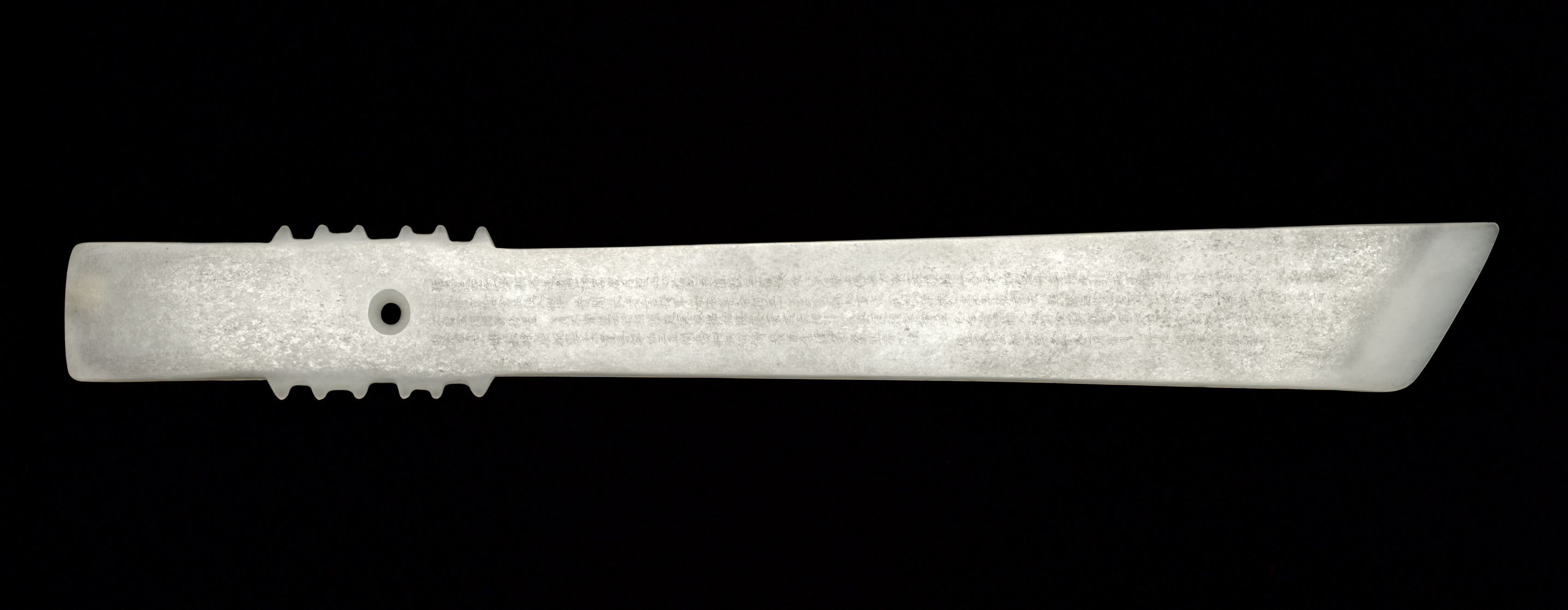 White jade scepter with a hole in the center. The scepter has a flat, wide end on the right and a more narrow end on the left with a serrated edge. The scepter features an inscription on its surface, presenting as densely packed text. The background is black.