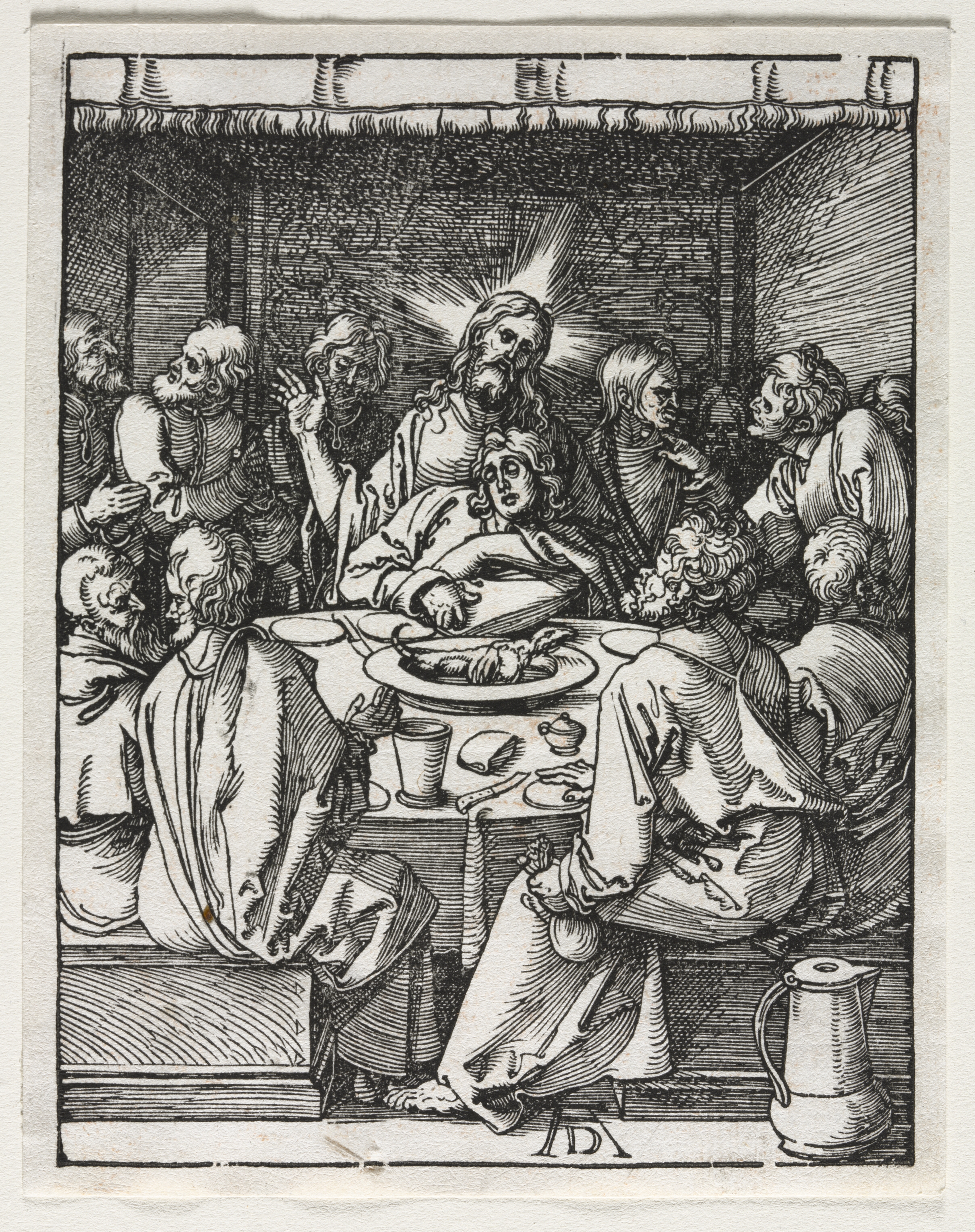 Black and white image of a group of men sitting around a table. The man on the left side of the table has his back to the viewer. The table has a plate with bread on it, a jug, and several cups. The other men are looking at the central figure. The central figure has a halo around his head. The man to his right is leaning back in his chair. The background shows a wall with lines suggesting texture or pattern. The image has a border around it with a rough edge.